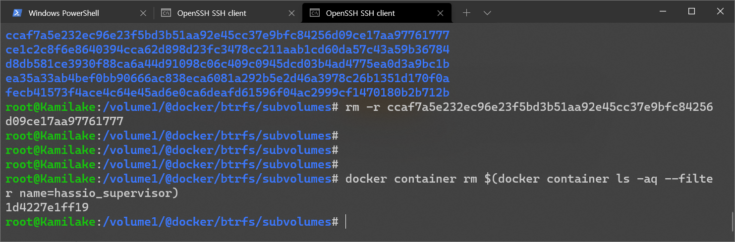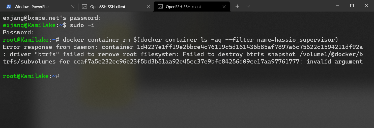 docker container rm $(docker container ls -aq --filter name=hassio_supervisor)