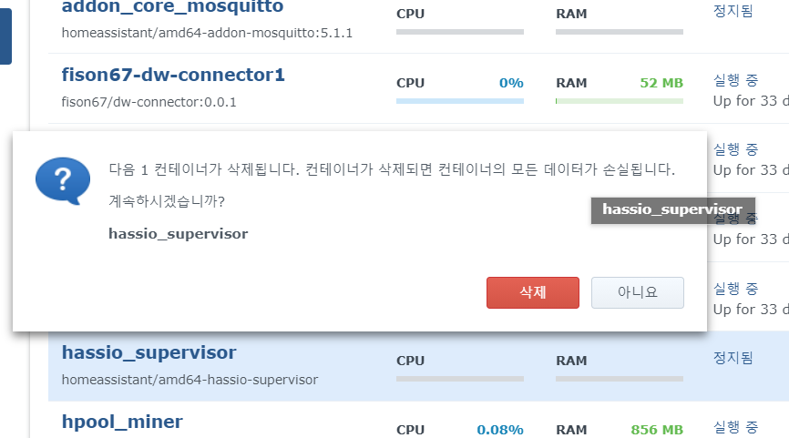 제가 삭제하려는 컨테이너의 이름은 hassio_supervisor 입니다.