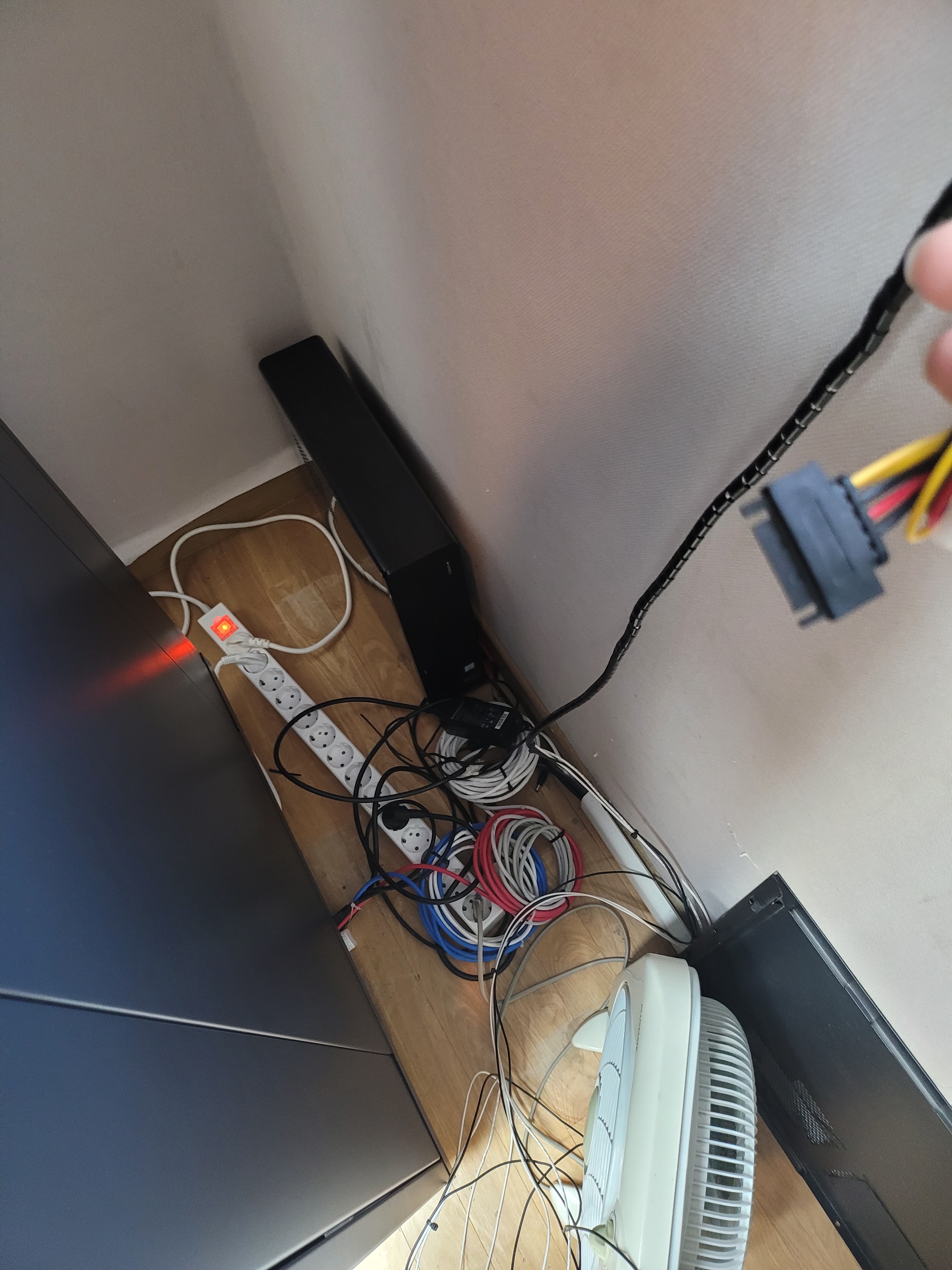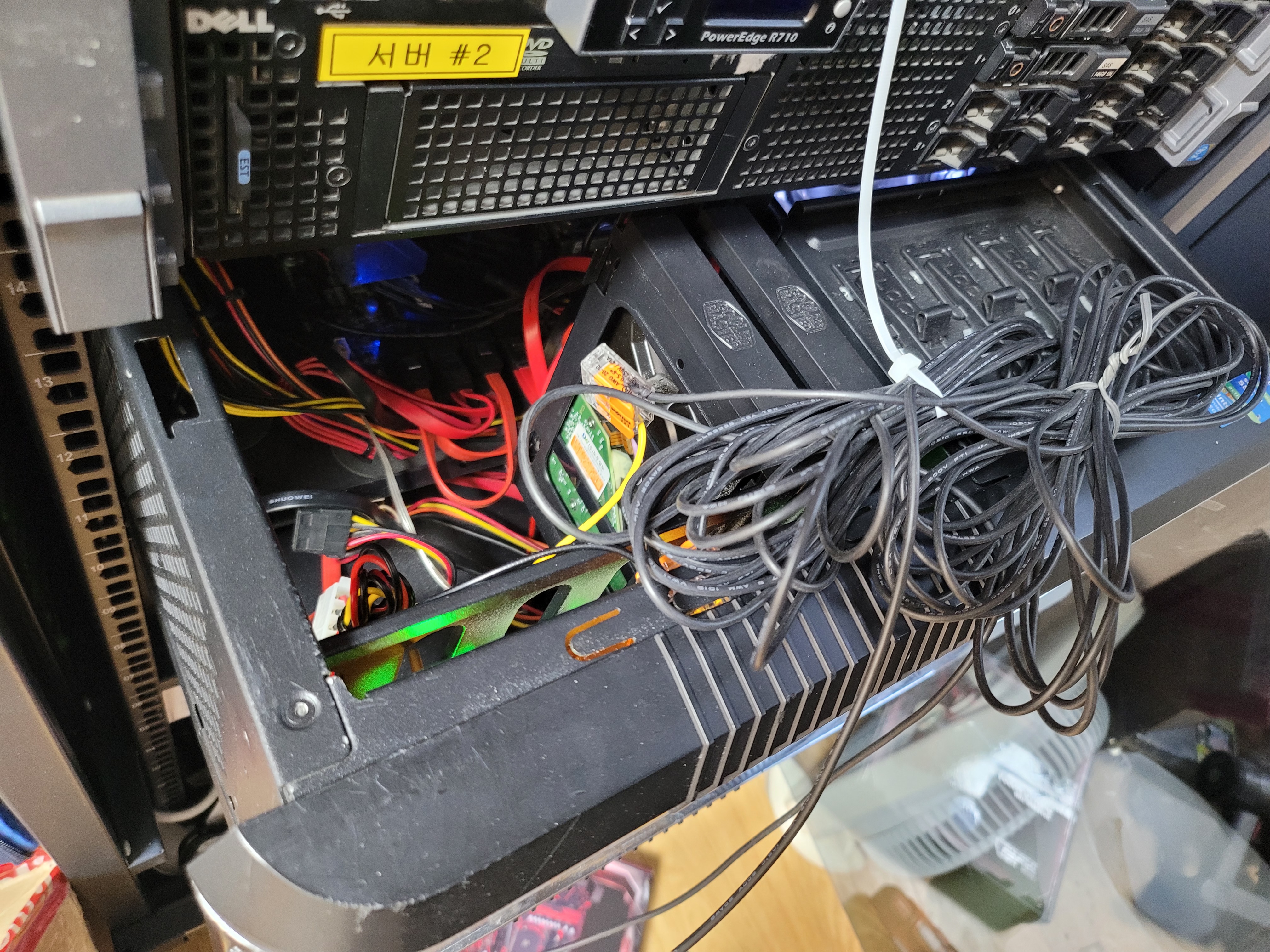 서버랙 밑에서 케이블을 뽑아 올려 본체 뒤 PCI 슬롯을 통과해 연결했습니다. 혼자서 60W가량 먹을 것 같지만 파워서플라이는 600와트라 버틸 수 있겠죠?