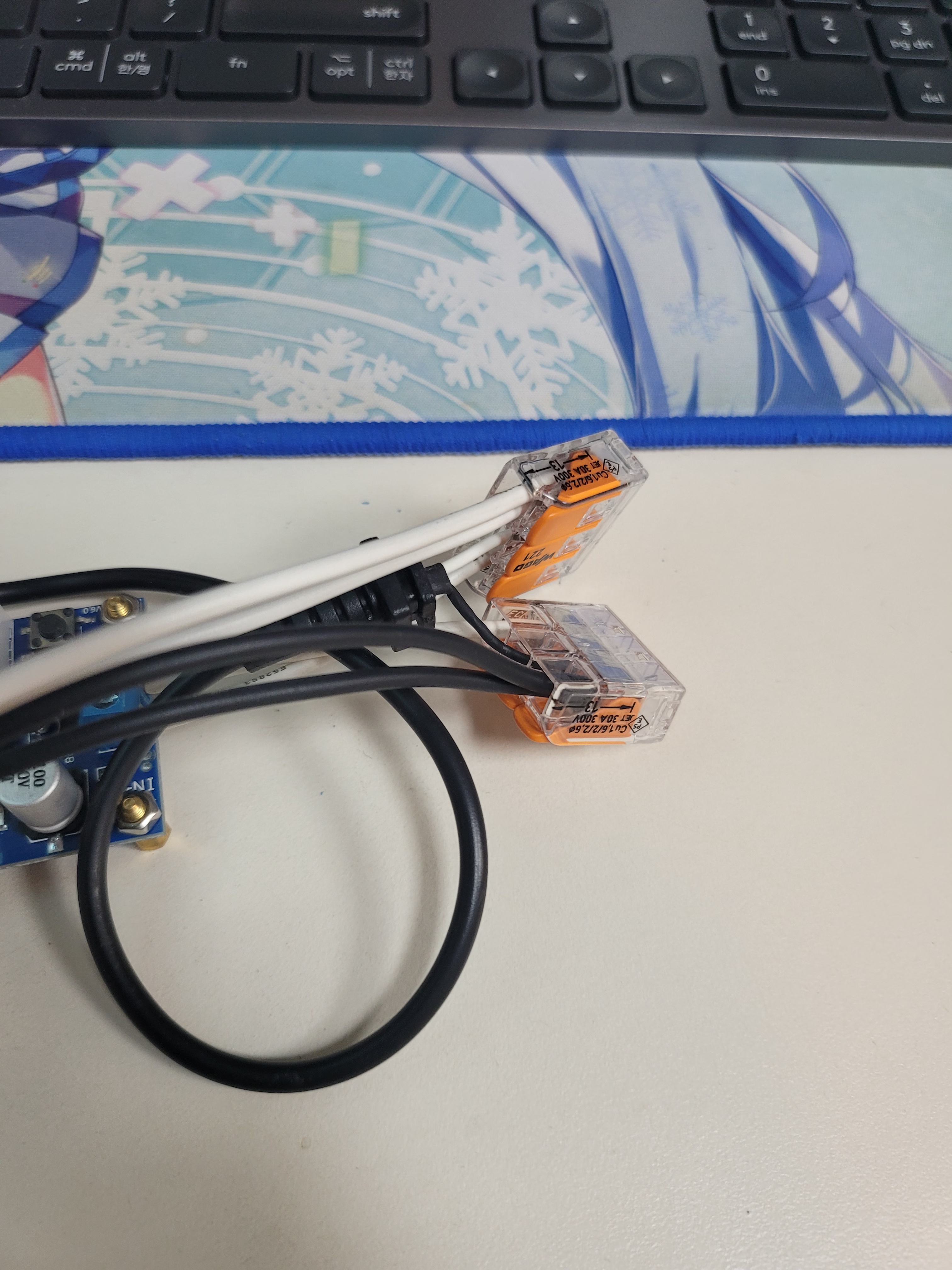 책상 쪽도 위로 선을 뽑아줍니다. 와고 커넥터는 생각보다 많은 전류를 처리할 수 있습니다. 단심선 연심선, DC 또는 AC220V의 케이블을 결선할 때도 아주 유용하며 손쉽게 전선을 정리할 수 있습니다.