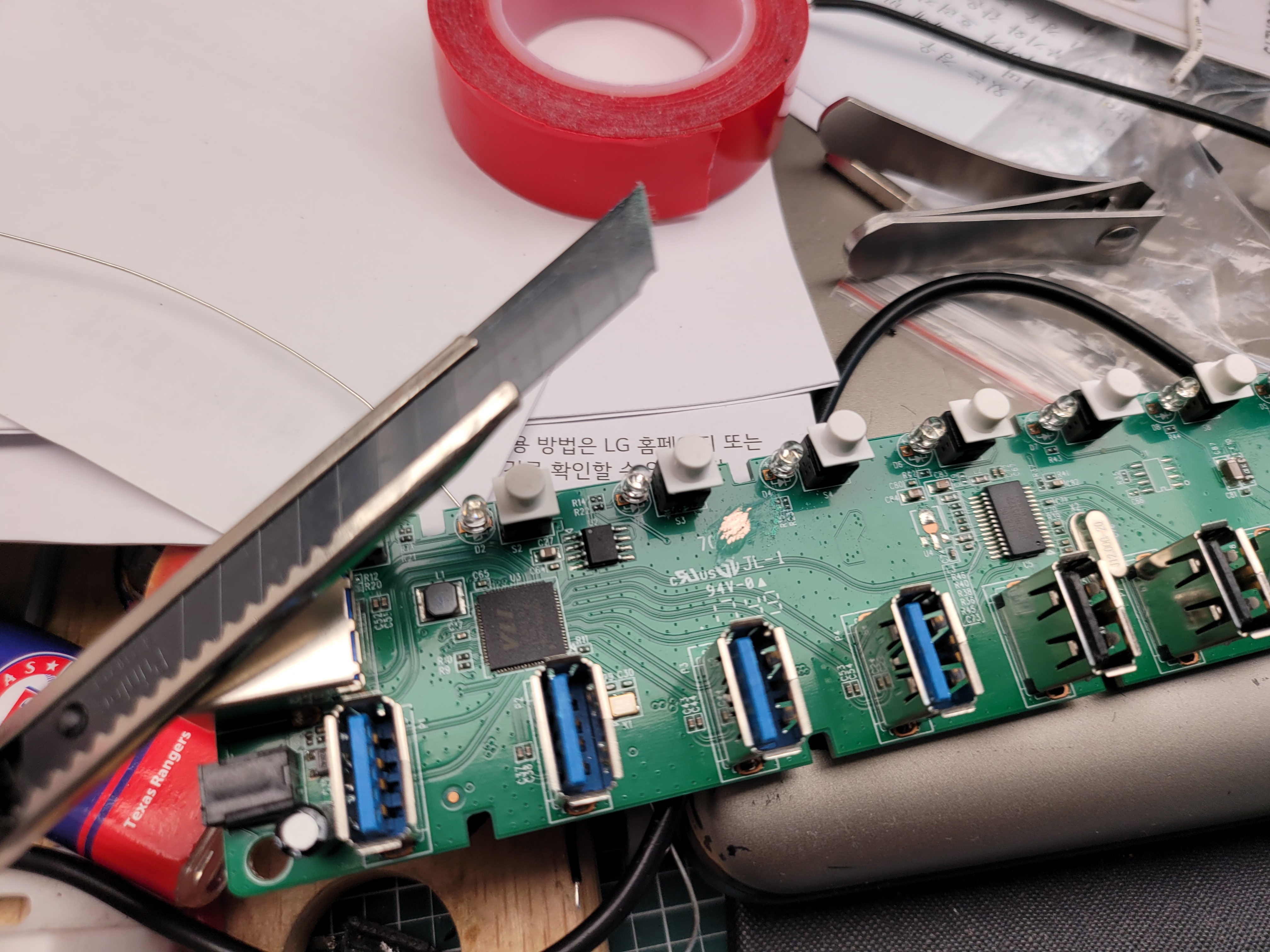 기존 3.5 배럴잭을 분리하고 그 위치에 케이블이 나가도록 해놨습니다. 배럴잭은 버리지 않고 저 남는 틈새에 쑤셔박아 놓으며 나중에 원상 복구하기 쉽겠죠