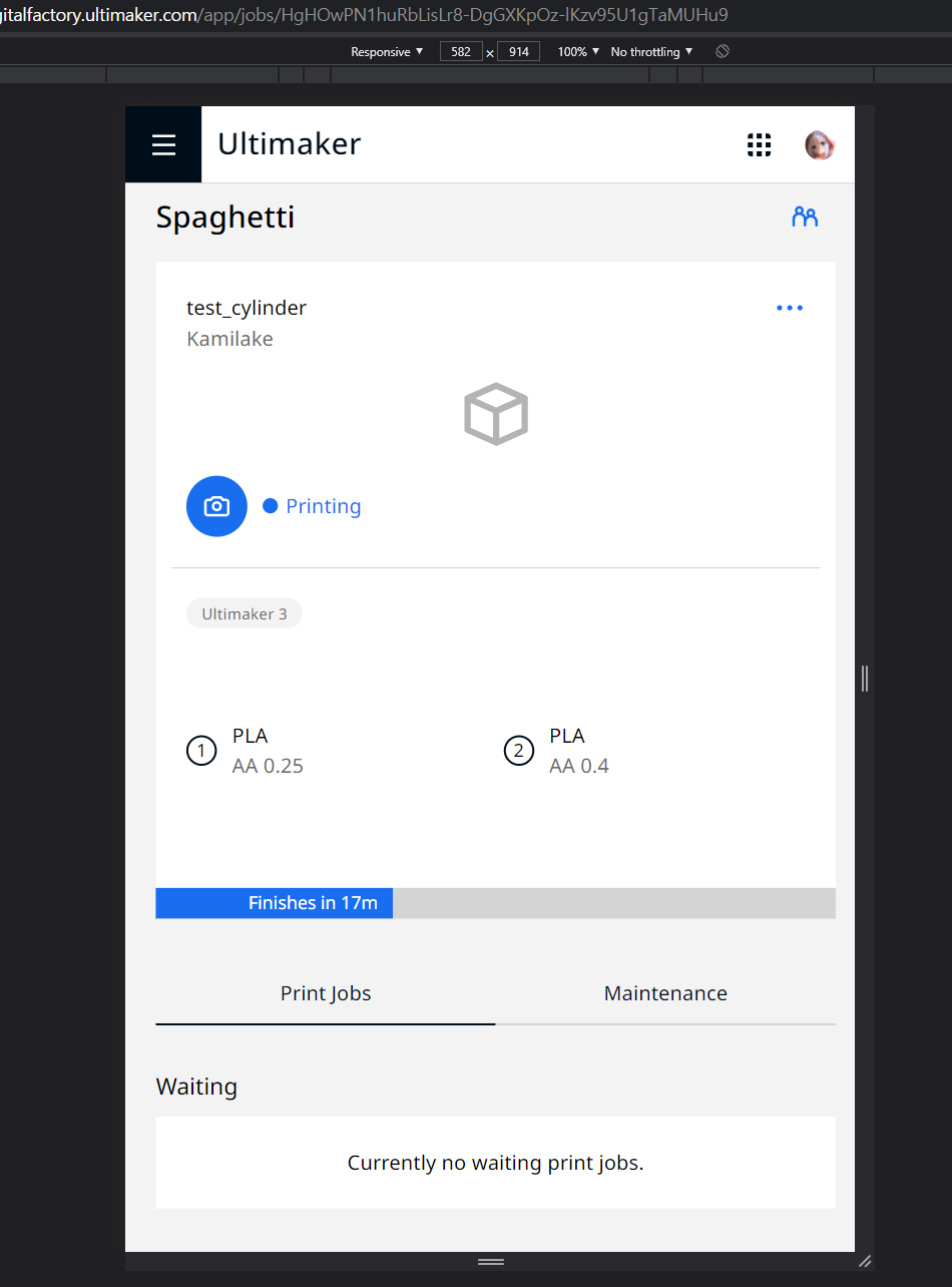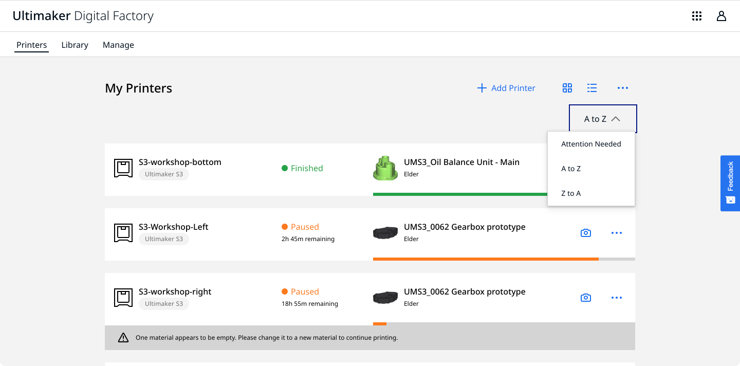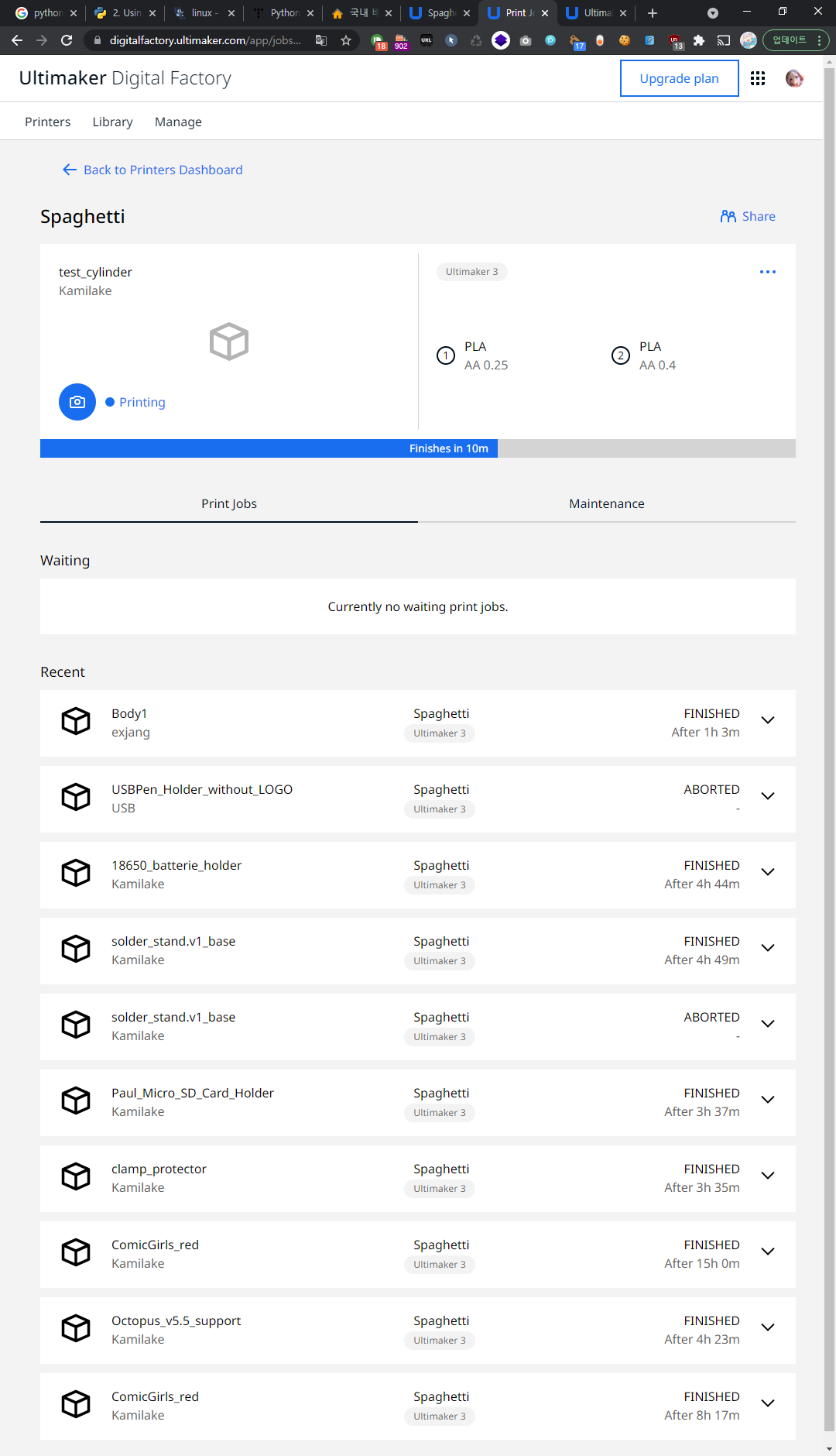 Ultimaker 3 프린터를 사용중인데 펌웨어를 업데이트하자 S 라인 제품군에서 사용하는 디지털 팩토리를 사용할 수 있게 되었습니다.