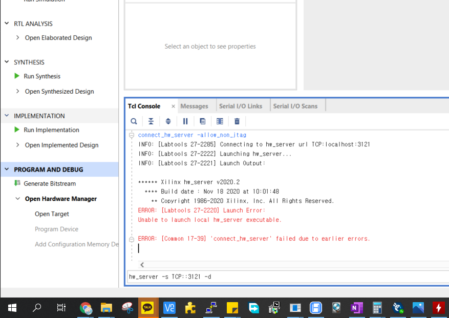 INFO: [Labtools 27-2285] Connecting to hw_server url TCP:localhost:3121 INFO: [Labtools 27-2222] Launching hw_server... INFO: [Labtools 27-2221] Launch Output: ****** Xilinx hw_server v2020.2 **** Build date : Nov 18 2020 at 10:01:48 ** Copyright 1986-2020 Xilinx, Inc. All Rights Reserved. ERROR: [Labtools 27-2220] Launch Error: Unable to launch local hw_server executable. ERROR: [Common 17-39] 'connect_hw_server' failed due to earlier errors. |