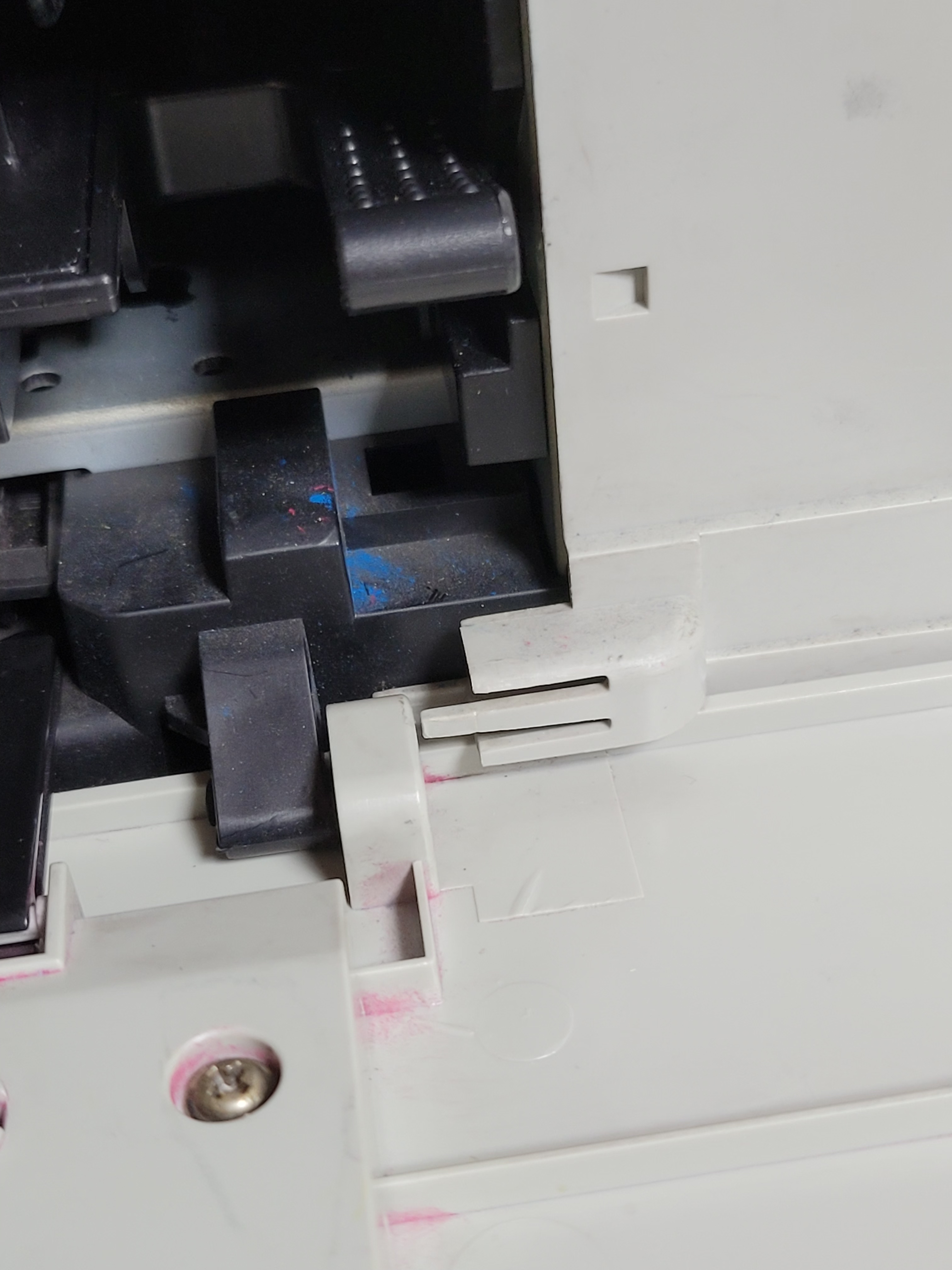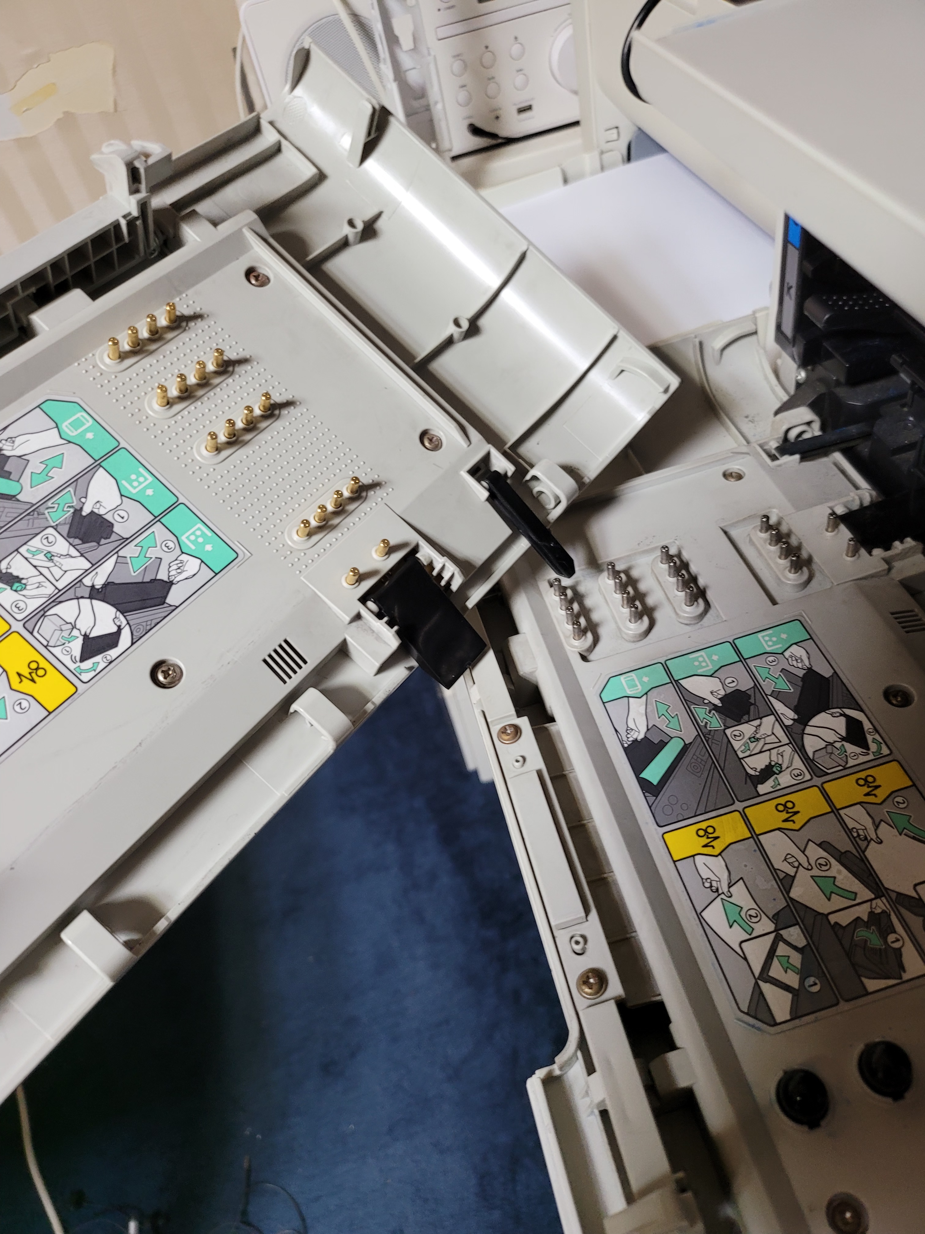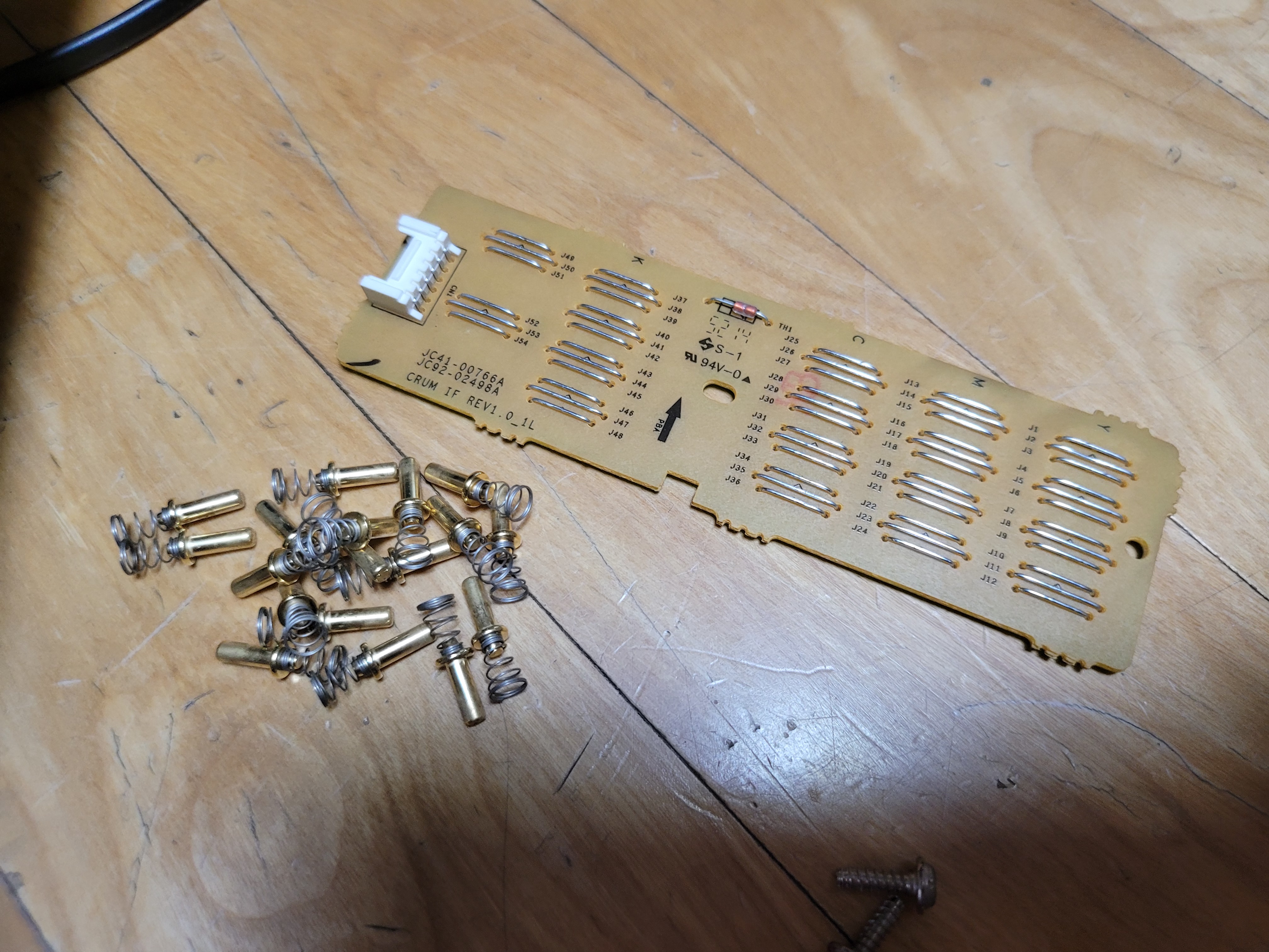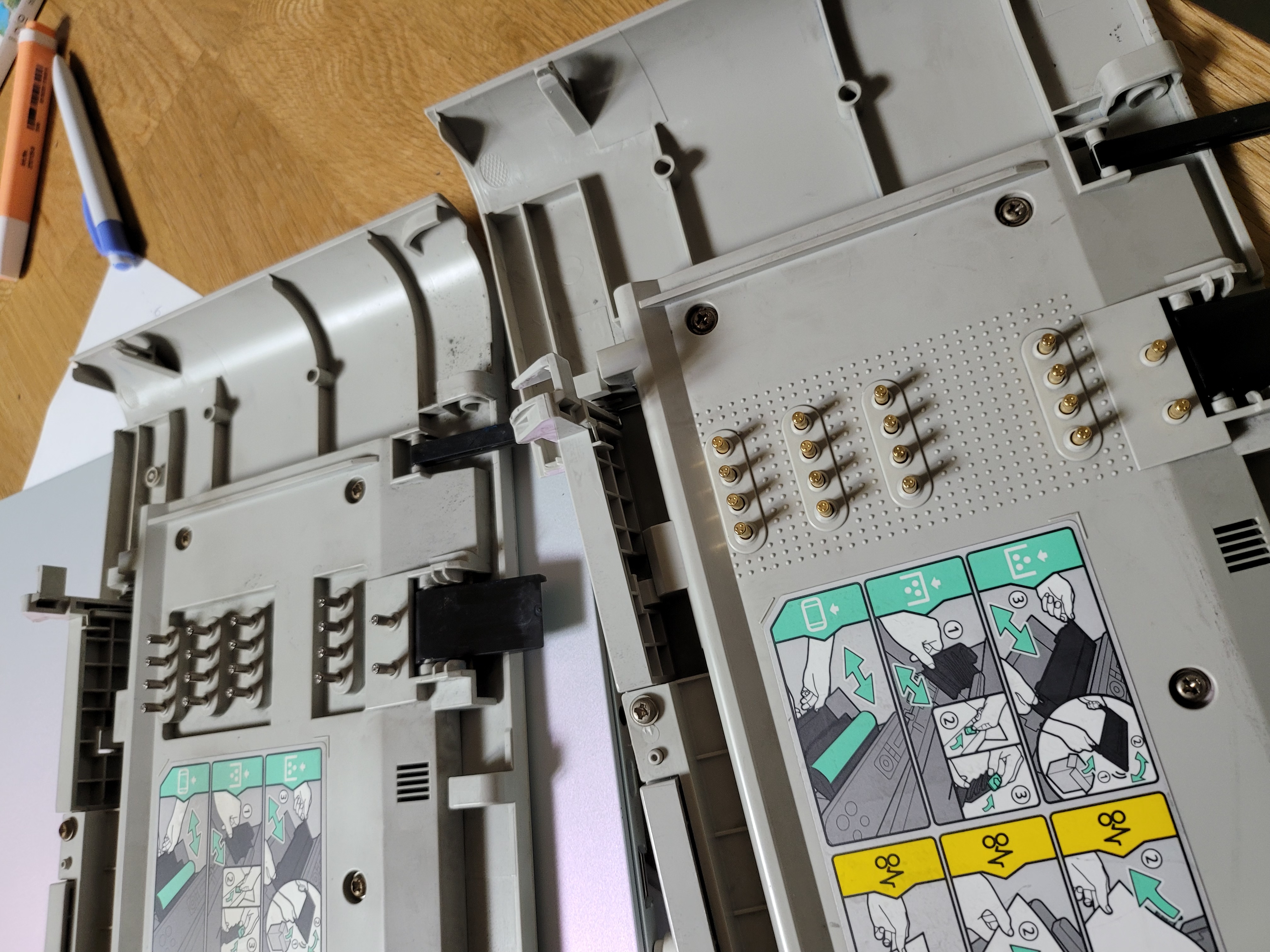 내부를 분해하면 핀과 접점 역할을 수행하는 작은 PCB를 볼 수 있는데 정체모를 흰색 가루가 있길래 모두 닦아주었습니다. 원래 저 금도금 핀은 SL-C473FW용 전면 도어인데 지금 사용하는 CLX-3305FW와 완전히 규격이 같아 보이네요