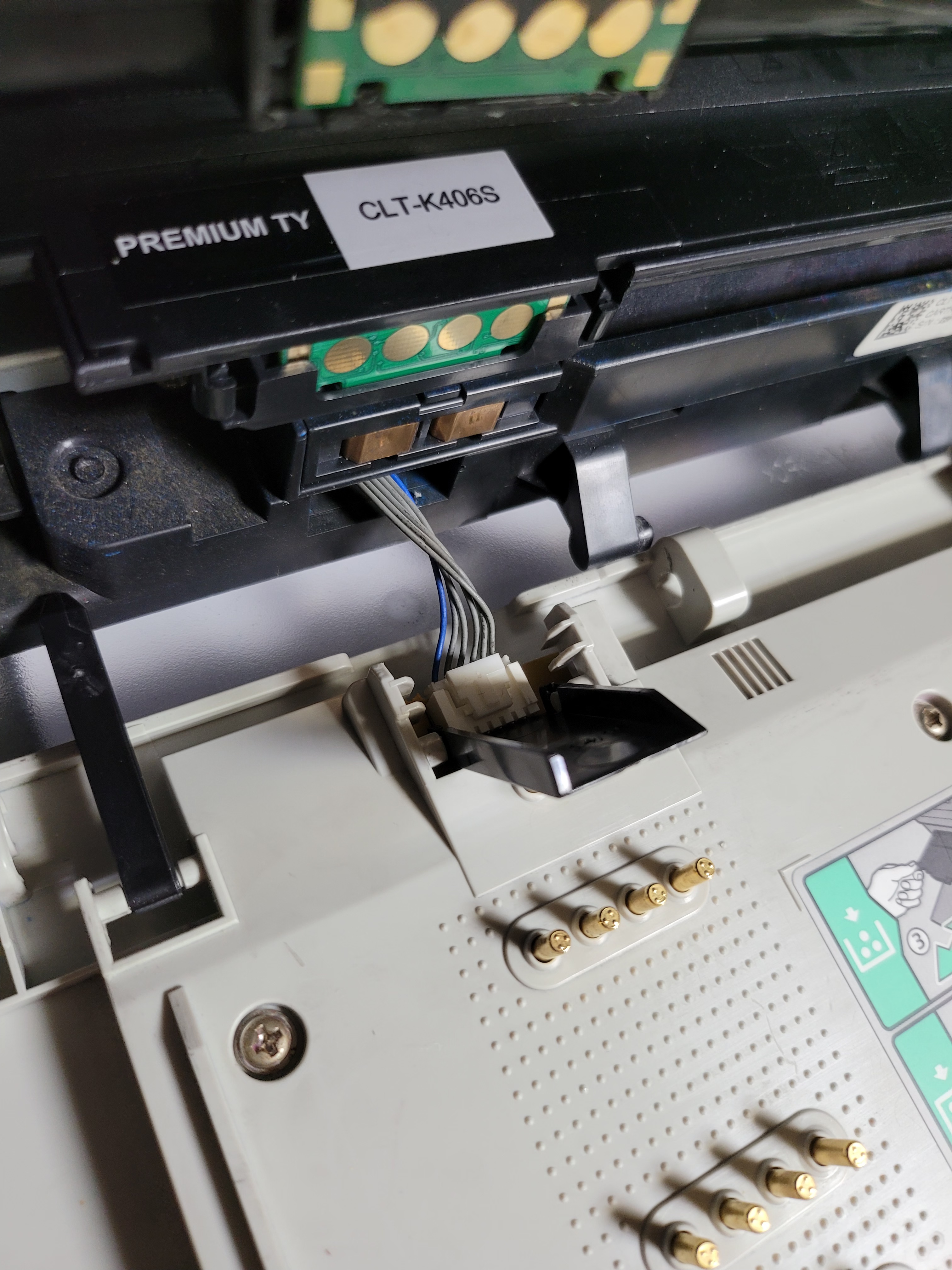 저 4핀은 VCC SDA SCL GND 즉 I2C 통신인데, 이게 실제 토너와 통신하는 건 아니고 단순히 정품인증 칩입니다. 즉 없어도 되는걸 굳이 저기다 달아놓은 거죠.. 토너 잔량을 체크한다는 변명이 있지만 그거 역시 소프트웨어로 수행하는데 전혀 문제가 없는 동작이구요.