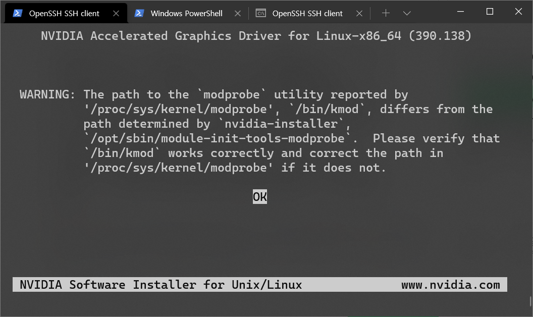 경고: '/proc/sys/kernel/modprobe', '/bin/kmod'에서 보고한 'modprobe' 유틸리티의 경로가 'nvia-installer', '/opt/sbin/module-init-tools-modprobe'에서 결정한 경로와 다릅니다. '/bin/kmod'가 올바르게 작동하는지 확인하고 '/proc/sys/kernel/modprobe'의 경로를 수정하십시오. |
