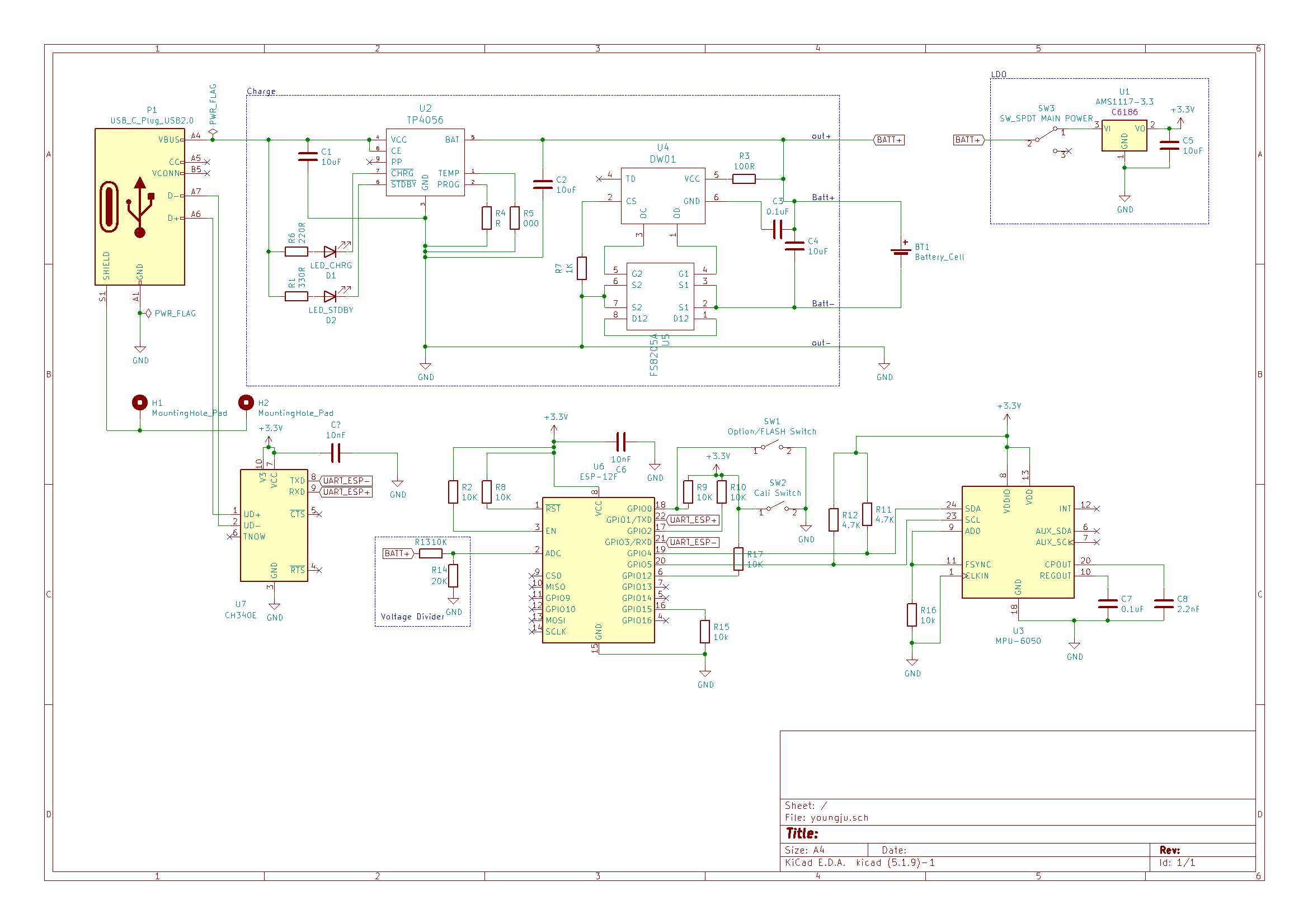 5V USB 전원을 그대로 받아먹는 ESP 개발보드와 달리 ESP8266자체는 원래부터 3.3v를 기반으로 작동했기에 AMS1117 LDO를 사용했습니다(3.3v 고정 전압이라 추가적인 회로는 필요 없었지만 리니어 레귤레이터인 만큼 발열은 있을 것 같아요) CH340E 내부에 있는 작은 레귤레이터를 사용하려고 했는데 전압이 모자라도 매우 모자라서 새로 달았습니다.