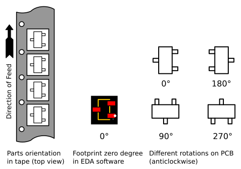 예를 들어 KiCad에서는 0도 회전을 부품의 1번 핀이 왼쪽 위로 간 상태를 의미하지만 JLCPCB는 위 사진과 같이 테이프의 방향에 따라 0도의 방향이 달라집니다.