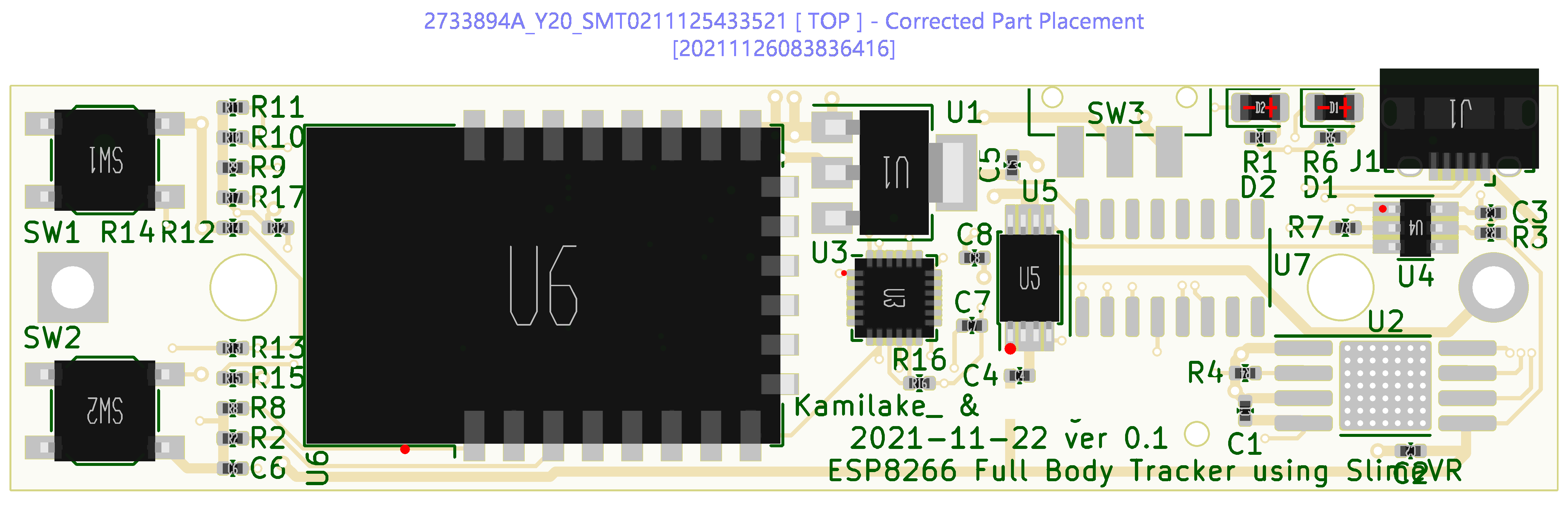 (gr_text "Kamilake_ & YoungJu10000                   \n2021-11-22 ver 0.1                  \nESP8266 Full Body Tracker using SlimeVR" (at -0.762 0) (layer F.SilkS) (tstamp 61A0782A)