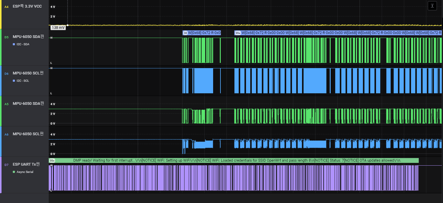 일단 저게 찍혀나온다는 건 ESP8266은 아무런 문제없이 I2C 신호를 쏴주고 있고