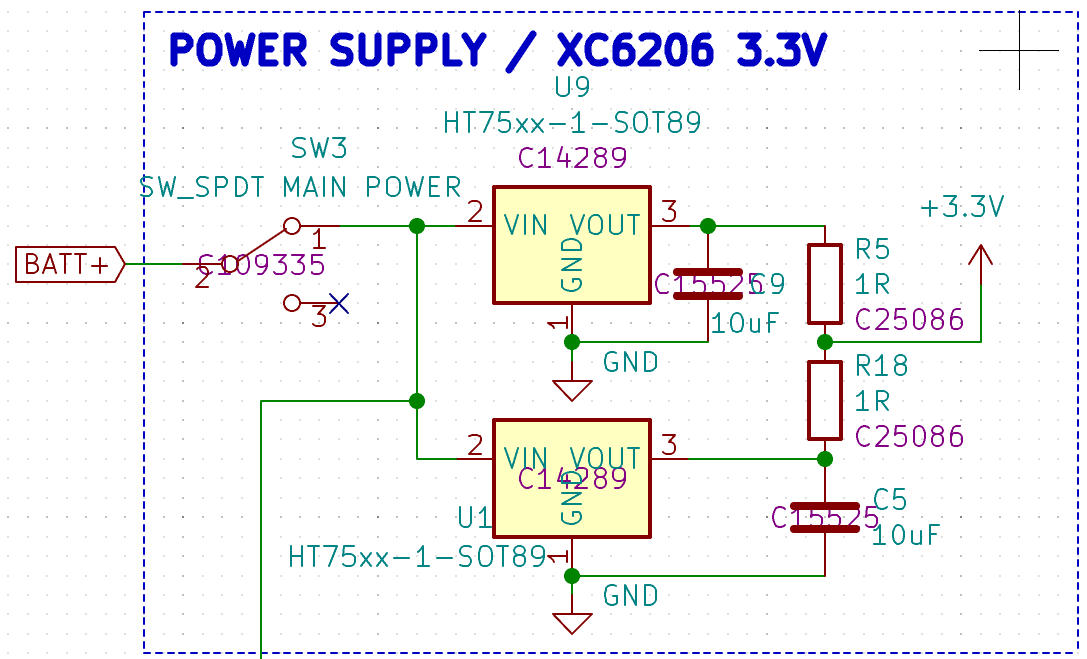 4.2V 리튬이온 배터리로부터 두개의 LDO 레귤레이터를 거쳐 3.3v를 만들어내는데 이 레귤레이터는 승압기능이 없습니다.