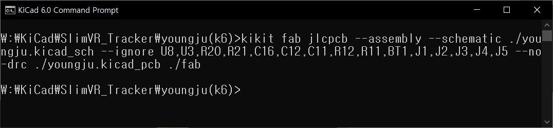 kikit fab jlcpcb --assembly --schematic ./youngju.kicad_sch --ignore U8,U3,R20,R21,C16,C12,C11,R12,R11,BT1,J1,J2,J3,J4,J5 --no-drc ./youngju.kicad_pcb ./fab