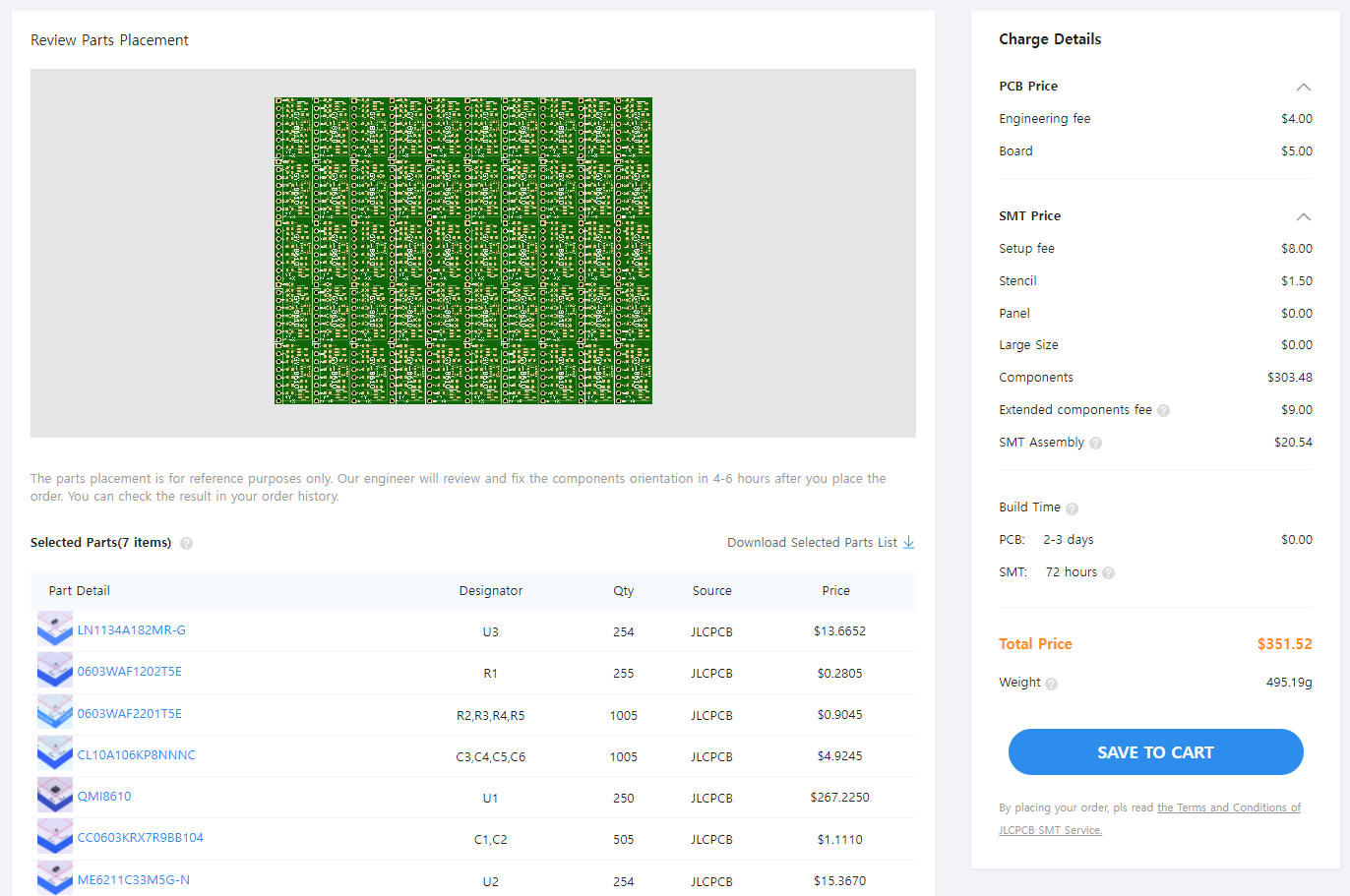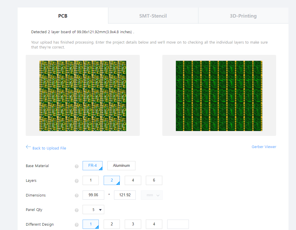첫째 줄은 5x10줄로 연배열 PCB를 만들어 패널화하겠다는 뜻입니다. JLC에서는 V-cut으로 가공이 가능하기 때문에 제대로 작동합니다.