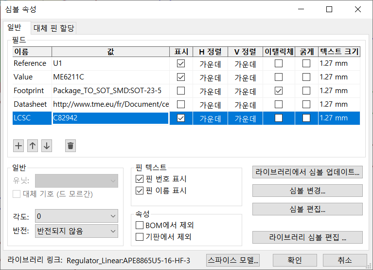 위 사진처럼 수정하고자 하는 심볼에서 E 키를 눌러 속성 메뉴를 연 다음, 이름이 LCSC인 필드를 만들면 됩니다.