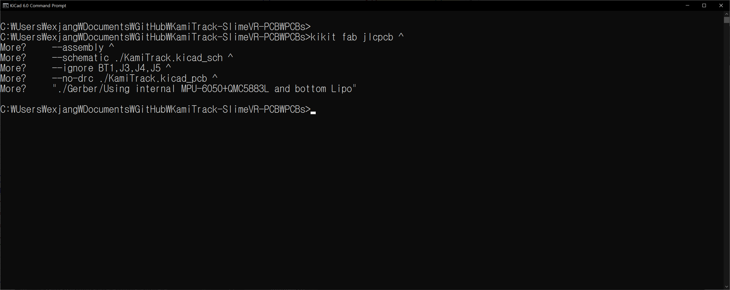 그다음은 QMI8610을 만들었을 때처럼 PCB를 Kikit으로 JLCPCB가 사용하는 포맷으로 변환합니다. 복잡한 플로팅 과정 없이 명령 한 줄로 해결할 수 있어요.