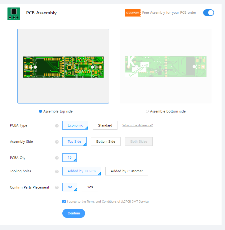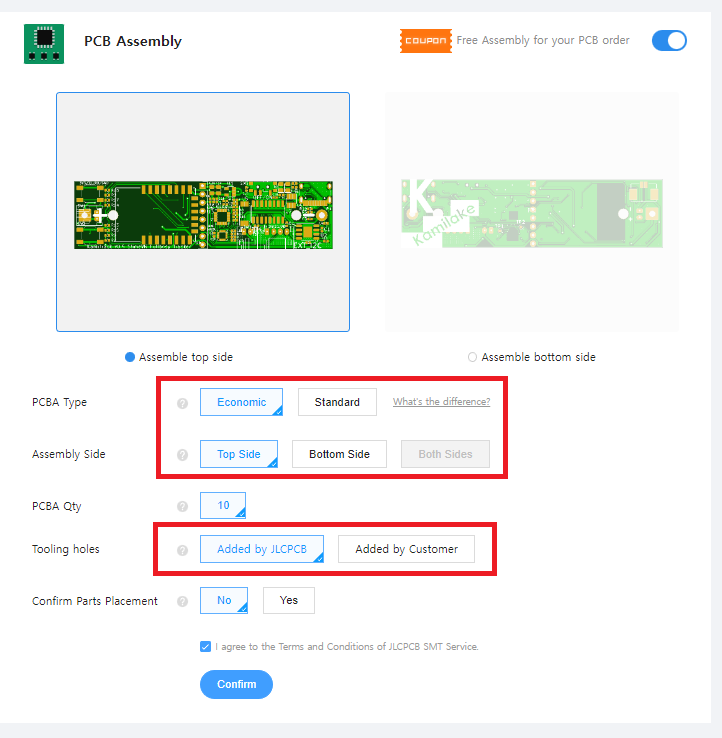 (위 보드에서는 에지 레일을 설치할 가장자리가 없고 툴링 홀을 타공 할 여분의 공간이 전혀 없기 때문에 PCB 조립 타입에서 스텐다드를 선택할 수 없어요)