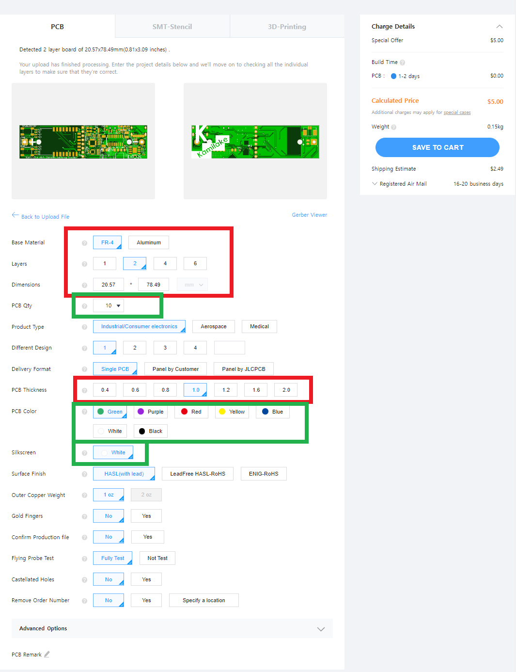 Gerber 파일을 업로드했으면 이제 어떻게 보드를 만들지 설명해야 합니다. 아래와 같이 저와 맞추면 돼요.