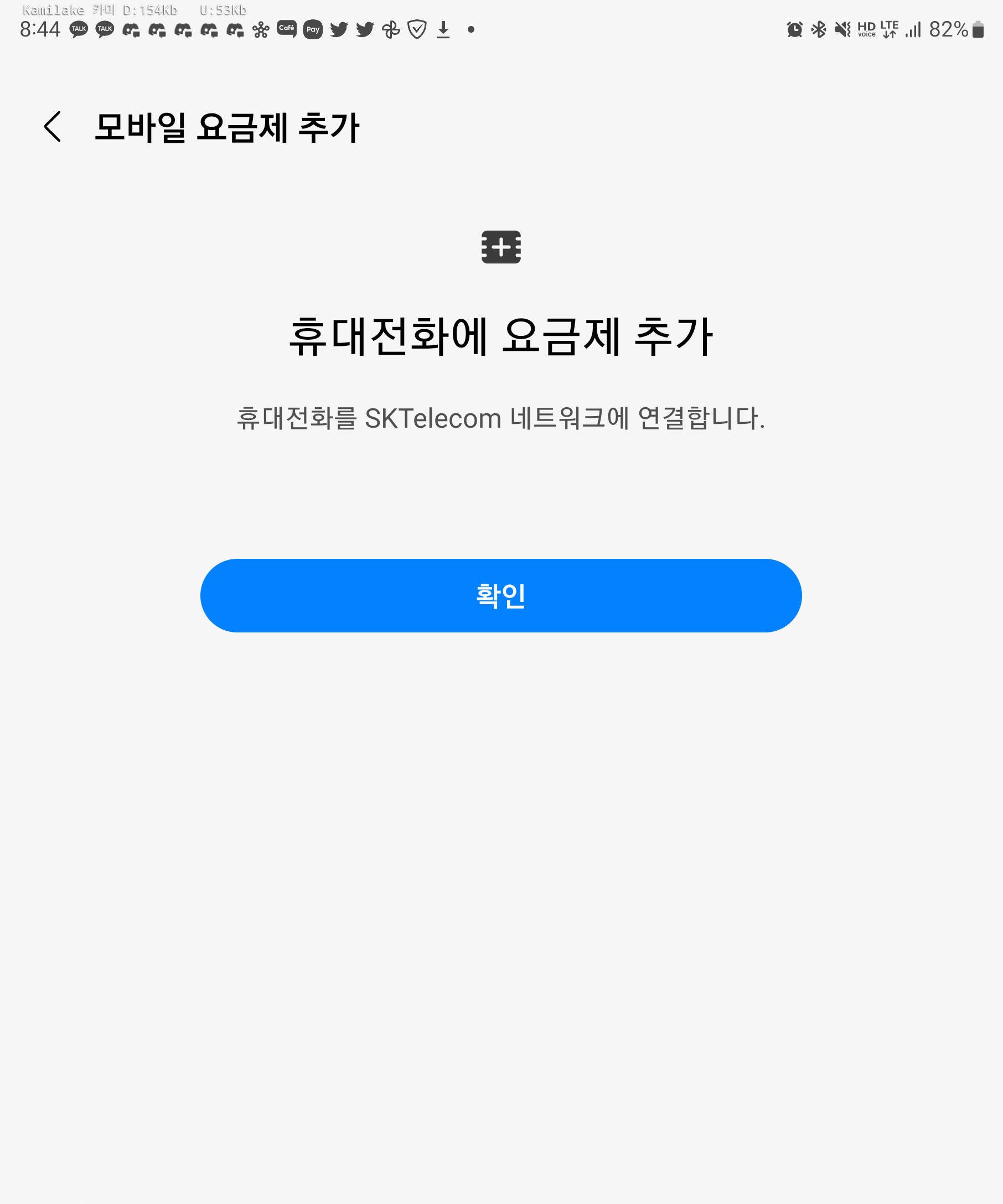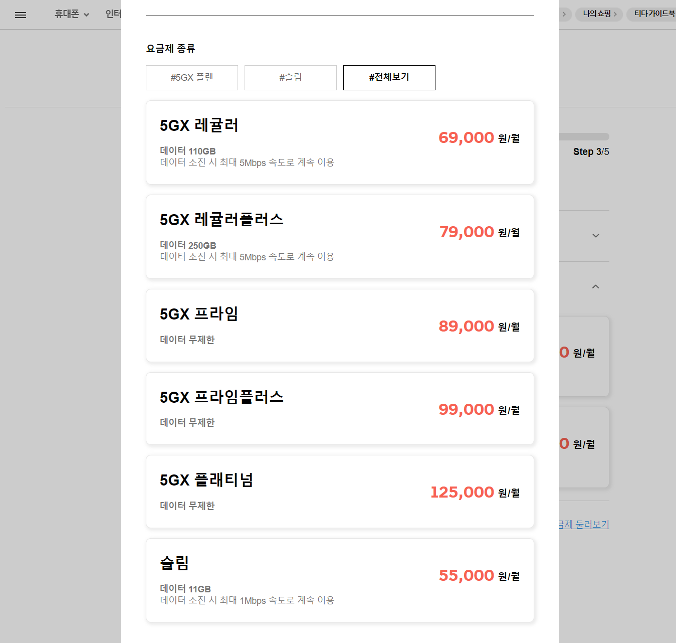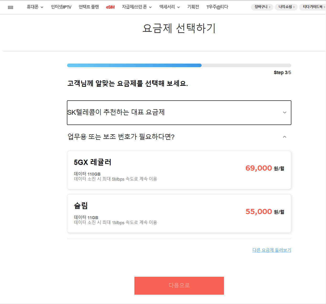 그 다음은 요금제를 선택하는 화면이 표시되는데, 제가 알기로는 모든 요금제를 사용할 수 있지만 저 페이지는 매우 불친절하게도 비싼 요금제만 나와있습니다.