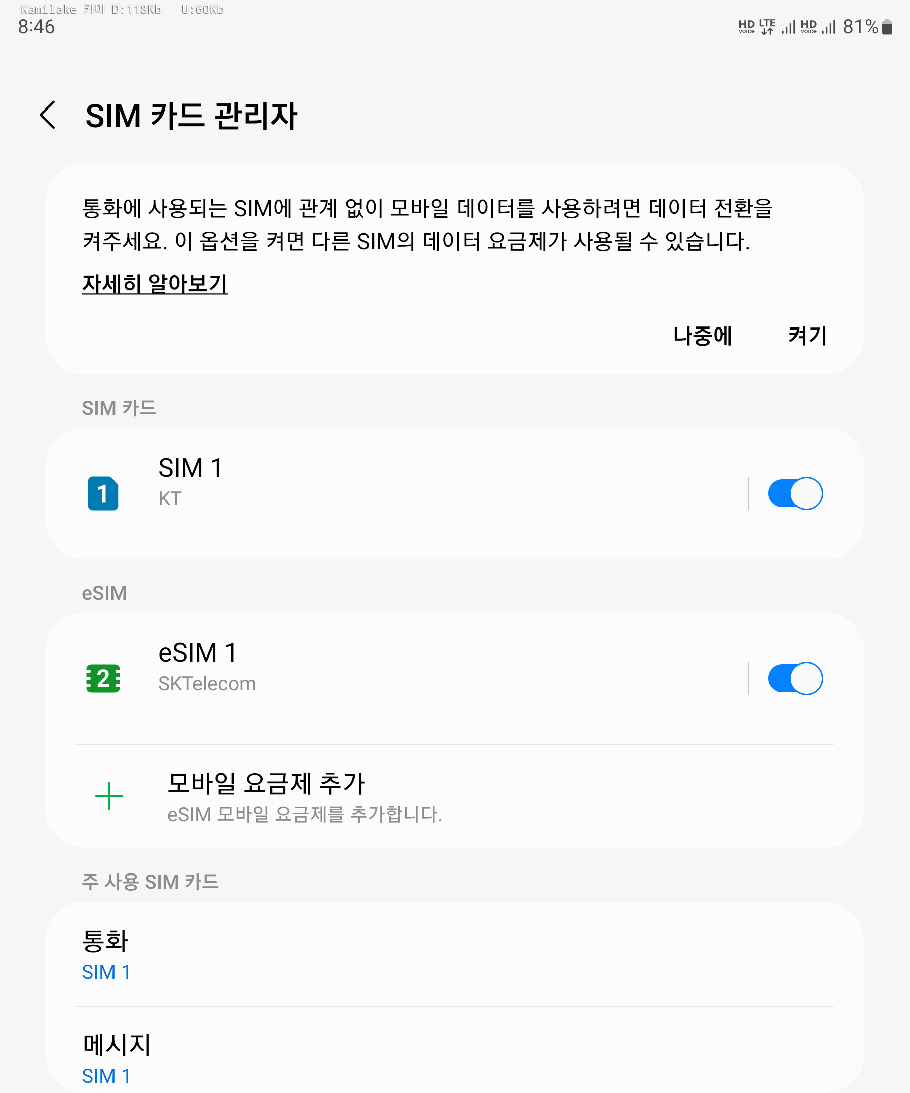 Wi-Fi 설정 아래에 있는 SIM카드 관리자를 통해 어떤 SIM으로 통화하고 메세지를 보내고 데이터를 사용할 지 선택할 수 있어요