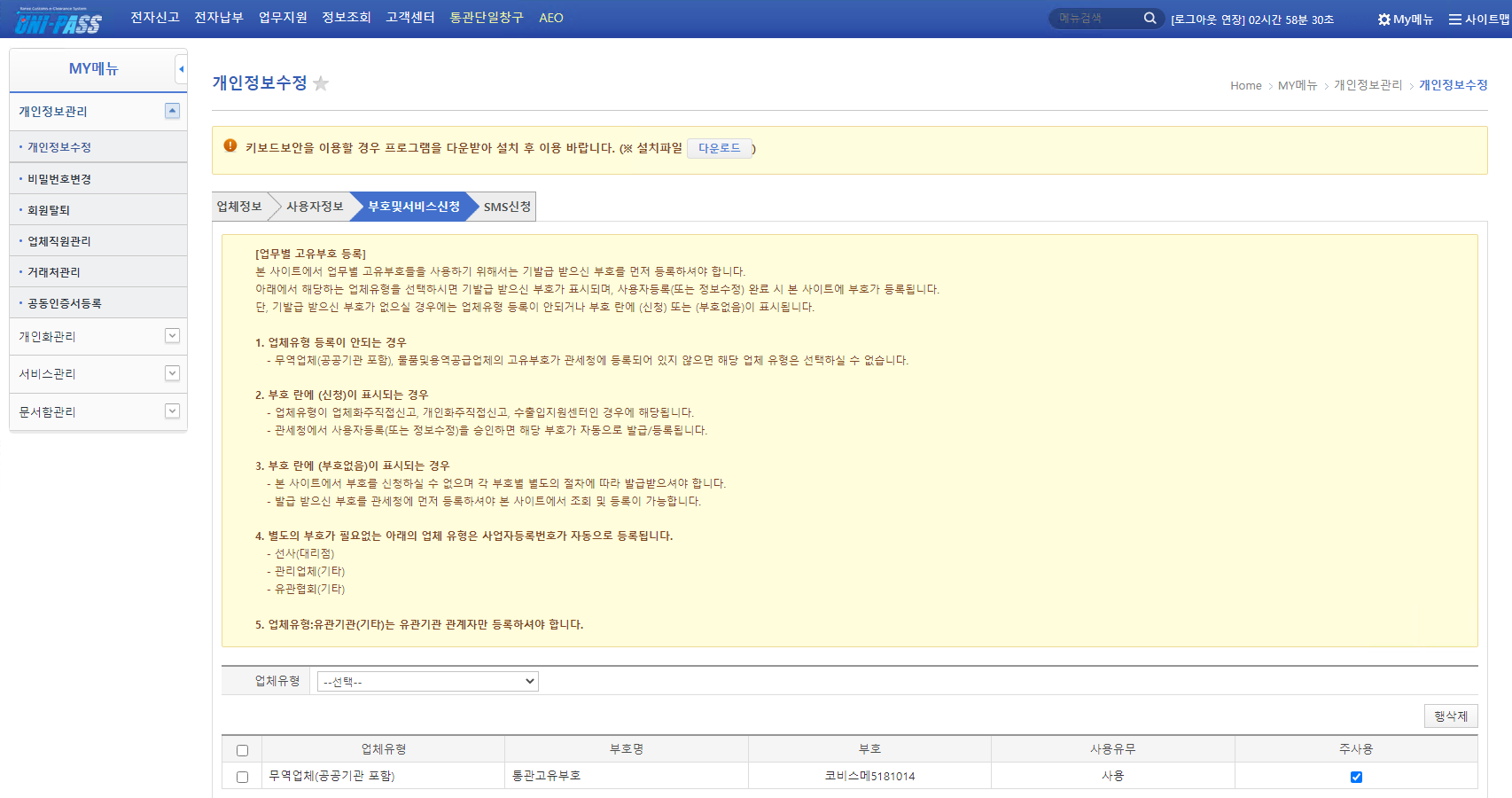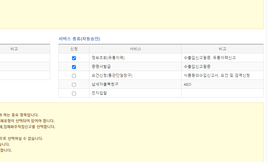 그대로 정보 수정 없이 다음->다음 버튼을 눌러 넘어가면 세 번째 탭인 "부호및서비스신청" 탭으로 넘어가게 되는데, 맨 아래를 보면 자동승인 서비스 중에 요건신청이 있습니다.