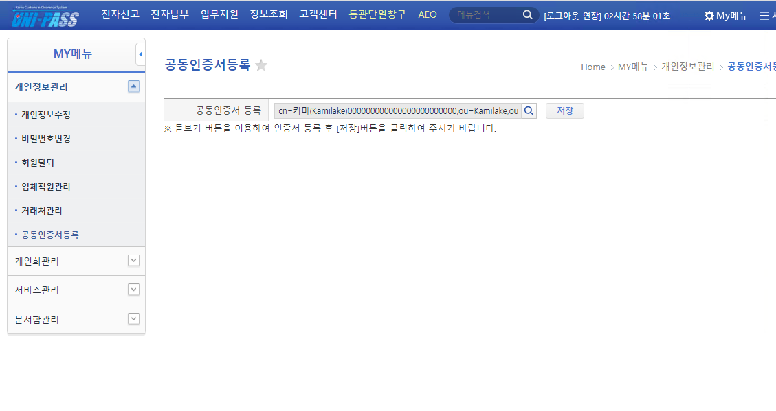 My메뉴->개인정보관리->공동인증서등록 메뉴에서 작은 돋보기를 눌러 인증서를 고르고 저장을 눌러주세요