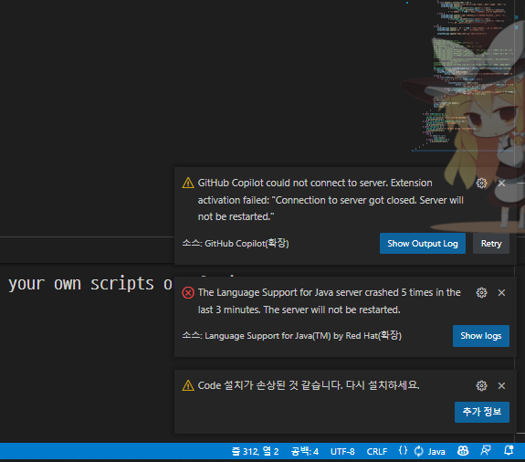 그래도 해결되지 않는다면 사진 중간처럼 Java의 언어 지원 서버가 충돌했다는 경고가 표시될 수 있는데, 자바 워크스페이스를 청소하면 나아질 수 있습니다.
