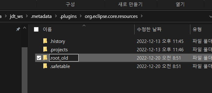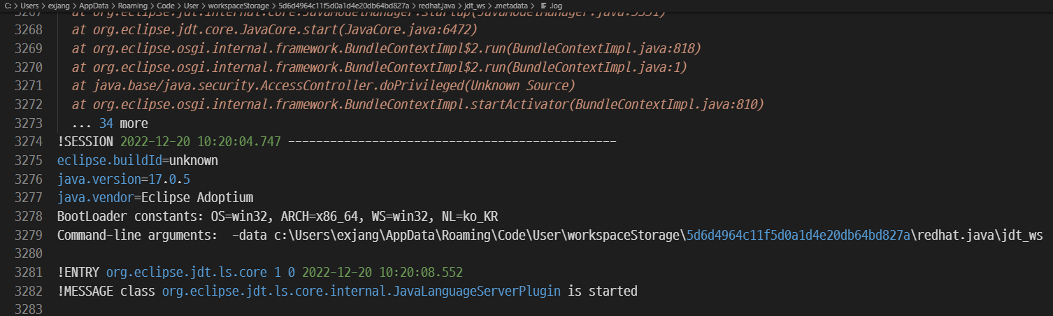 먼저, "C:\Users\exjang\AppData\Roaming\Code\User\workspaceStorage\5d6d4964c11f5d0a1d4e20db64bd827a\redhat.java\jdt_ws\.metadata\.plugins\org.eclipse.core.resources\" (사용자마다 다른 경로) 경로로 이동해서 .root를 찾아볼게요