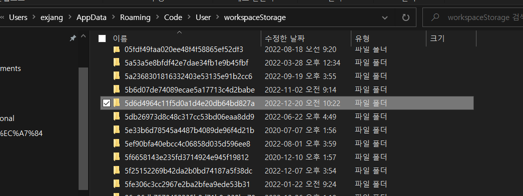 위 로그에서 본 워크스페이스의 상위 폴더인 "C:\Users\exjang\AppData\Roaming\Code\User\workspaceStorage"(사용자마다 다른 경로)로 들어가서 "5d6d4964c11f5d0a1d4e20db64bd827a"(프로젝트마다 다른 경로, 로그에 출력됨)를 삭제하세요