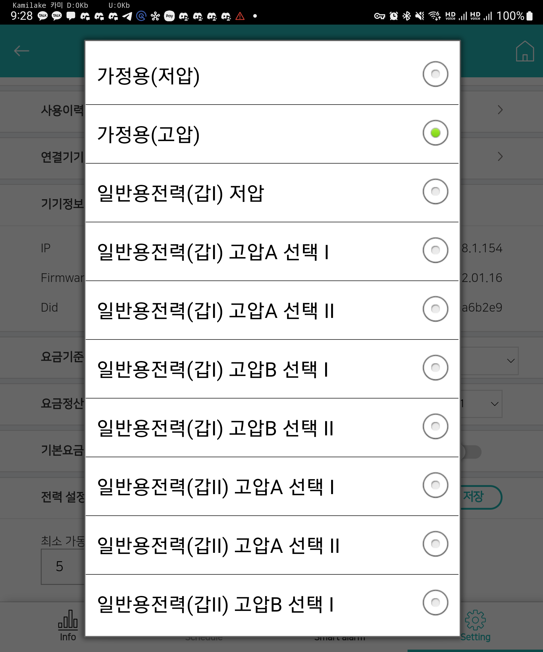 요금 기준을 설정하려면 Setting -> 요금기준 -> 가정용(고압)을 선택해주세요.