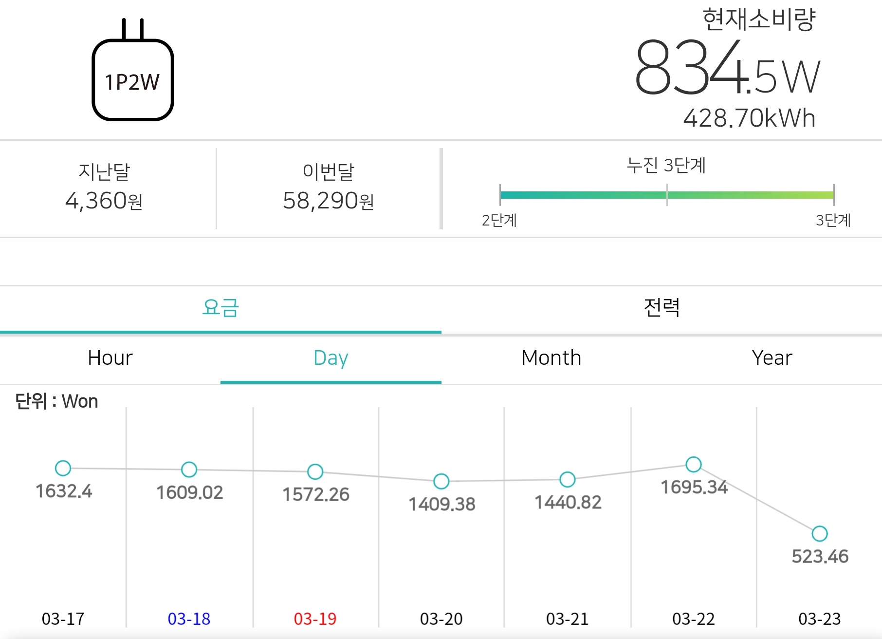 제가 사용하는 전력량이 어마어마하네요. 아직 한달지 지나지도 않았는데 벌써 누진 3단계로 표시되고 일별 요금이 2천원을 향해가고 있습니다.