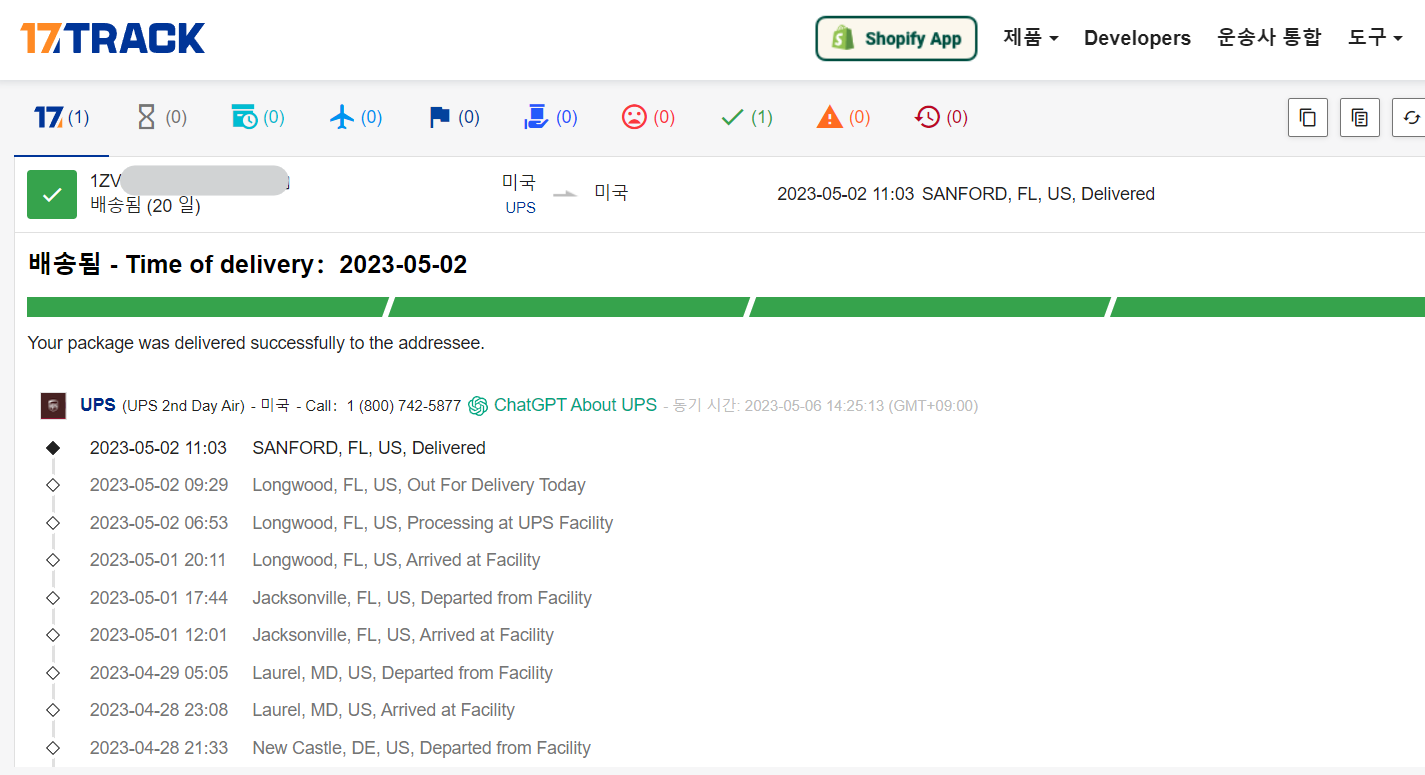"운송사 인계 완료" 가 표시된다면 UPS가 택배를 픽업했기에 대부분 며칠 이내로 센터에 도착하게 됩니다. 그 뒤로는 아래처럼 반품 추적 링크에서 17TRACK으로 조회하시면 됩니다.