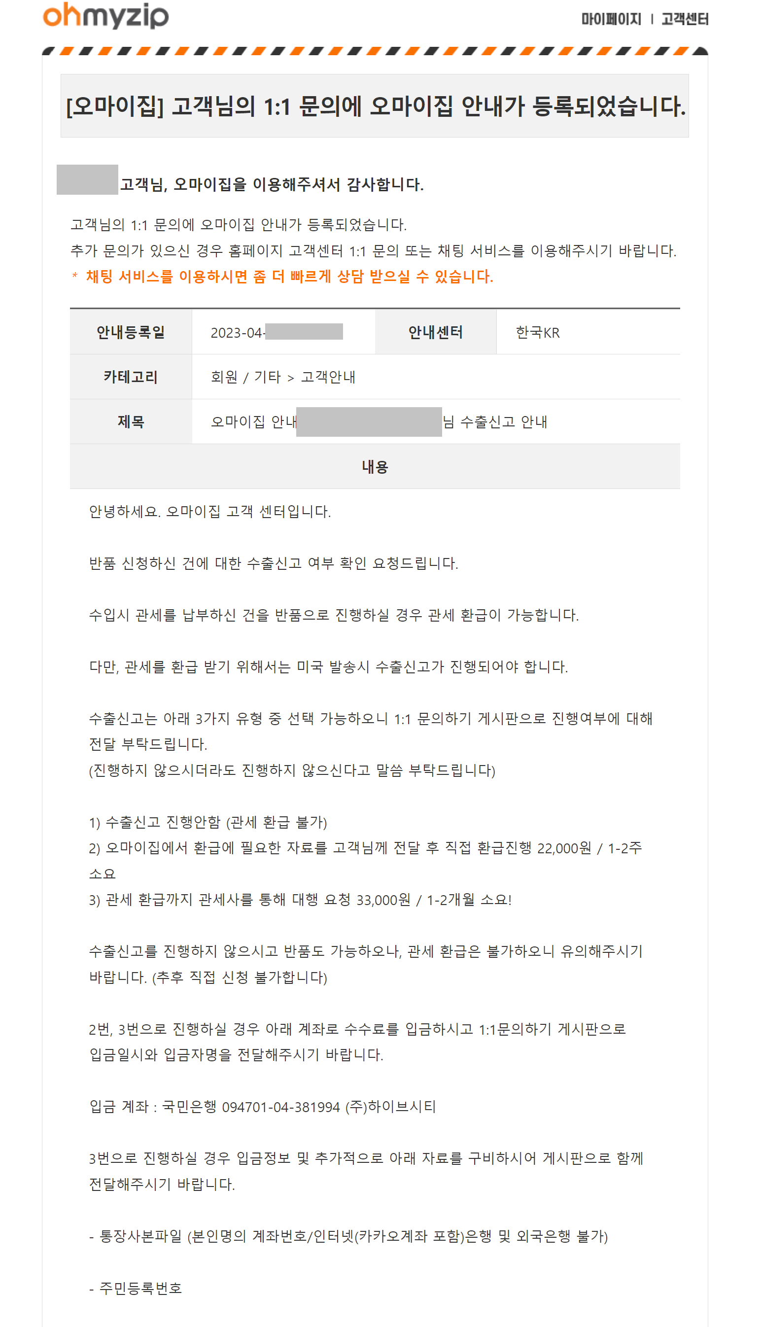 반품 사유서 내용을 캡처를 못했는데, 세관에 보내는 서류지만 이름 적고 사인하는 게 끝이어서 걱정하지 마세요