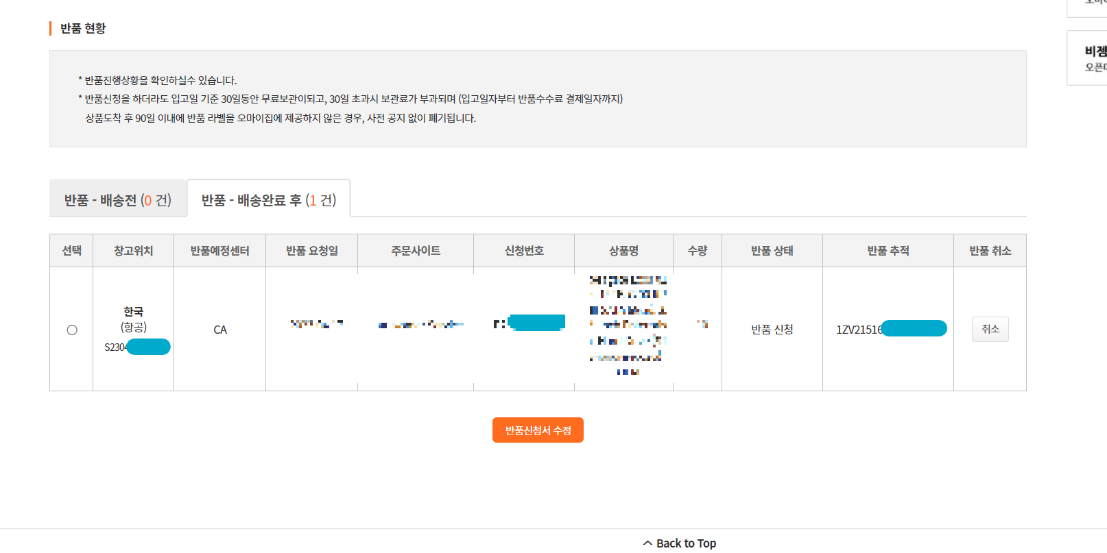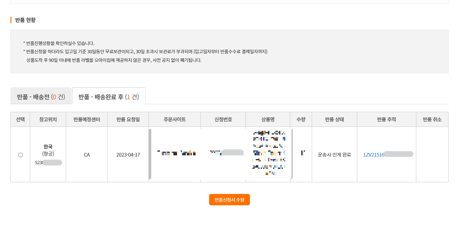 그리고 며칠 기다리면 오마이집 반품현황에서 추적번호를 볼 수 있는데, 이걸로 택배가 서버파트딜에 도착했는지 알 수 있습니다.