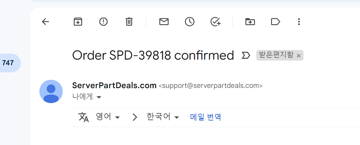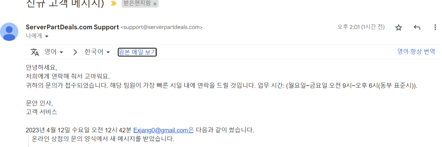 5월 2일에 택배가 무사히 서버파트딜에 입고되었고 5월 4일에 메일을 받았어요.