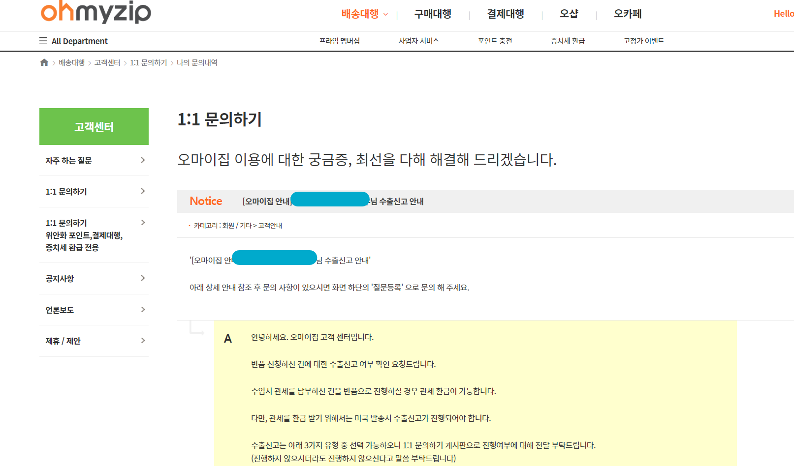 택배는 우리가 보내는 게 아니라 오마이집 측에서 수거요청을 하는데, 이때 문 앞에 박스를 내놓기만 하면 알아서 기사님이 가져가실 테니 걱정마세요