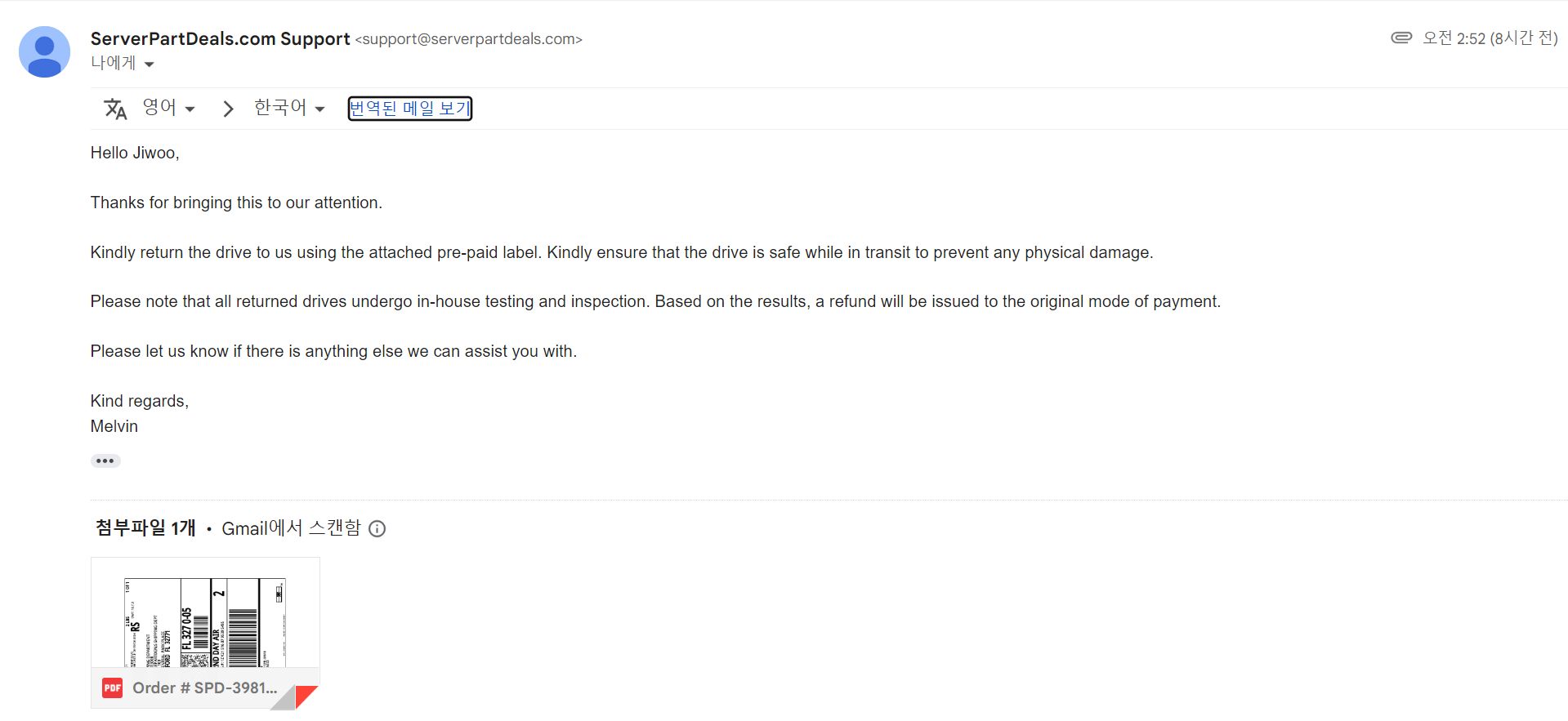 어제 새벽 3시에 택배로 하드 보내면 확인해보고 돈준다는 내용과 함께 쿨하게 무상 리턴라벨을 바로 보내주셨더군요. 대화할 필요도 없이 바로 반품보내면 됩니다.