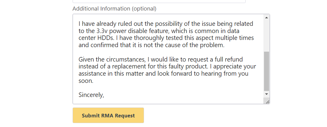 HDD는 고장나면 소비자가 수리할 수 있는 부분은 사실상 없고 외부에도 건드릴 수 있는 기능이 아무것도 없다보니 그냥 버리거나 환불해야 합니다. 다행히 대부분의 판매자는 초기 불량에 대한 교환/환불을 제공하고 이 서비스를 통해 서버파트딜에 환불을 요청해보록 하겠습니다.