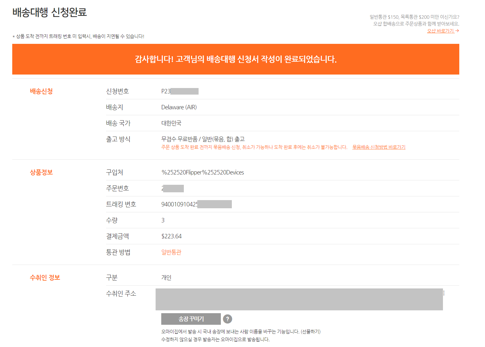 주문 후에 몇 시간도 지나지 않아서 바로 운송장을 받았기에 배송대행 신청까지 마쳤습니다.