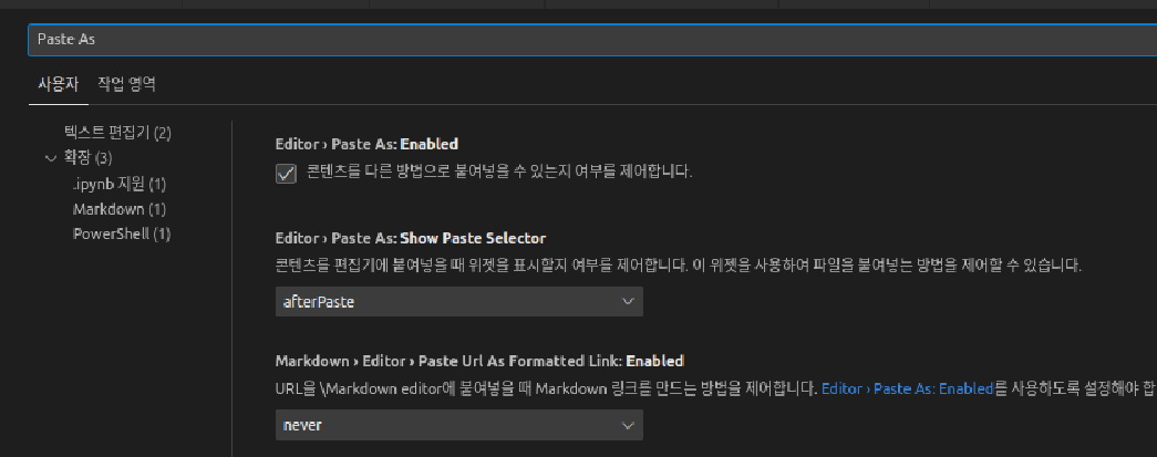 Paste As의 체크를 해제하면 오로지 VSCode의 기본 방법으로만 붙여넣을 수 있습니다.