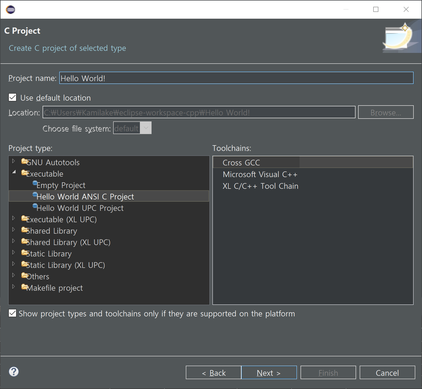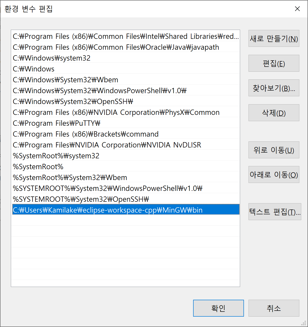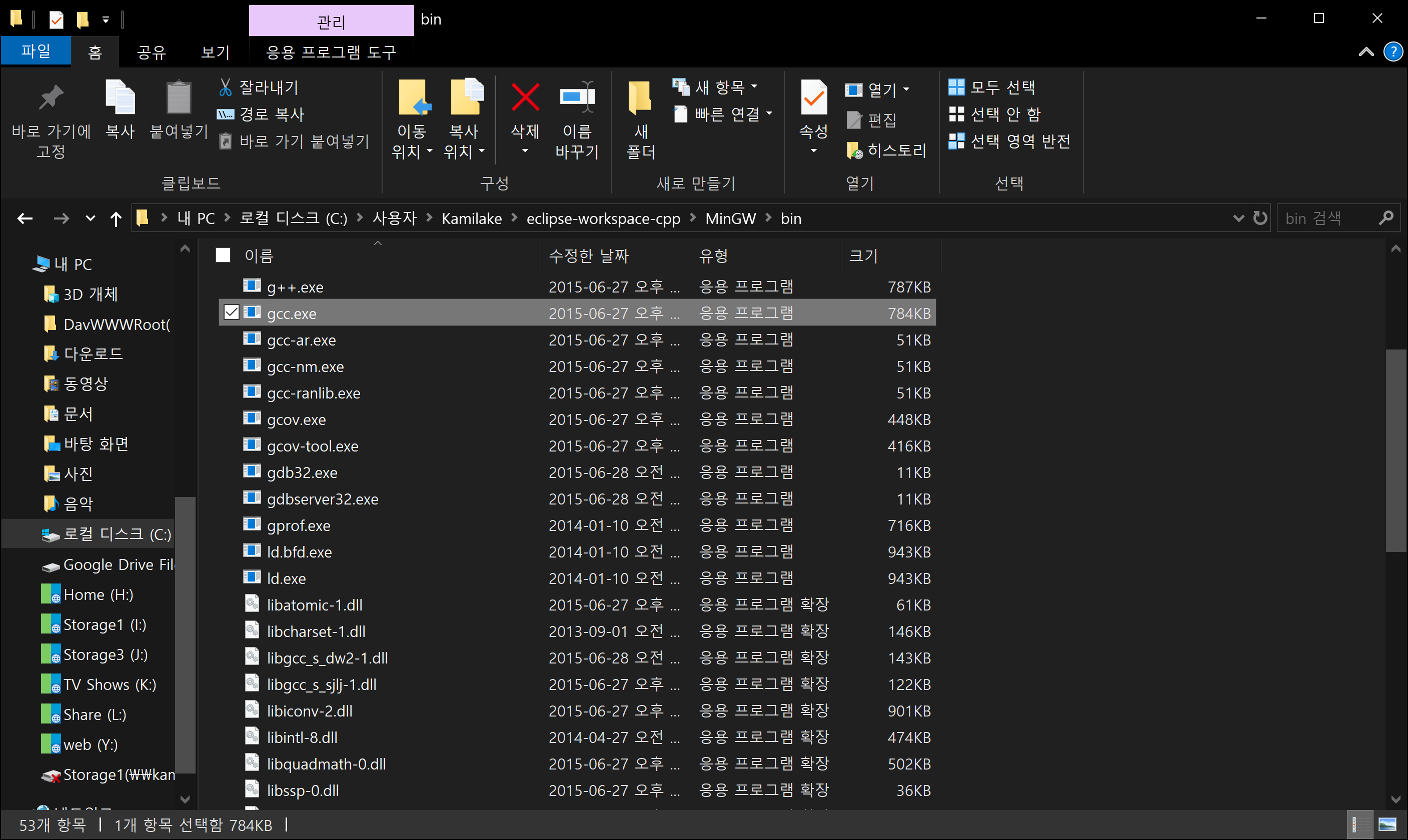 이 글에서는 C:\Users\Kamilake\eclipse-workspace-cpp\MinGW\bin 경로를 사용하겠습니다.