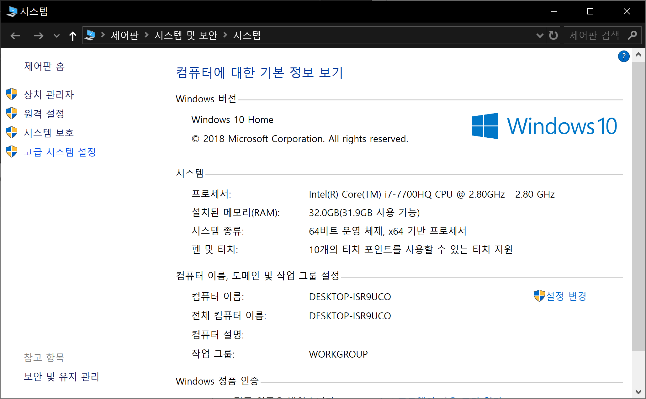 Windows키 + Pause/Break 키를 눌러서 시스템 속성으로 들어가주세요.