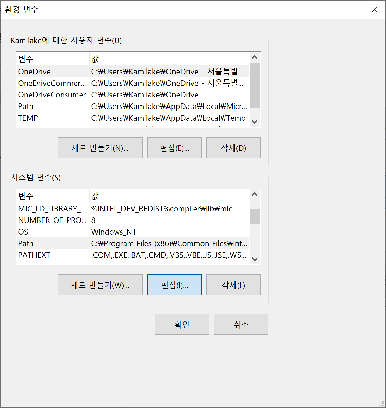 편집(I)...을 눌러 Path 변수를 편집합니다.