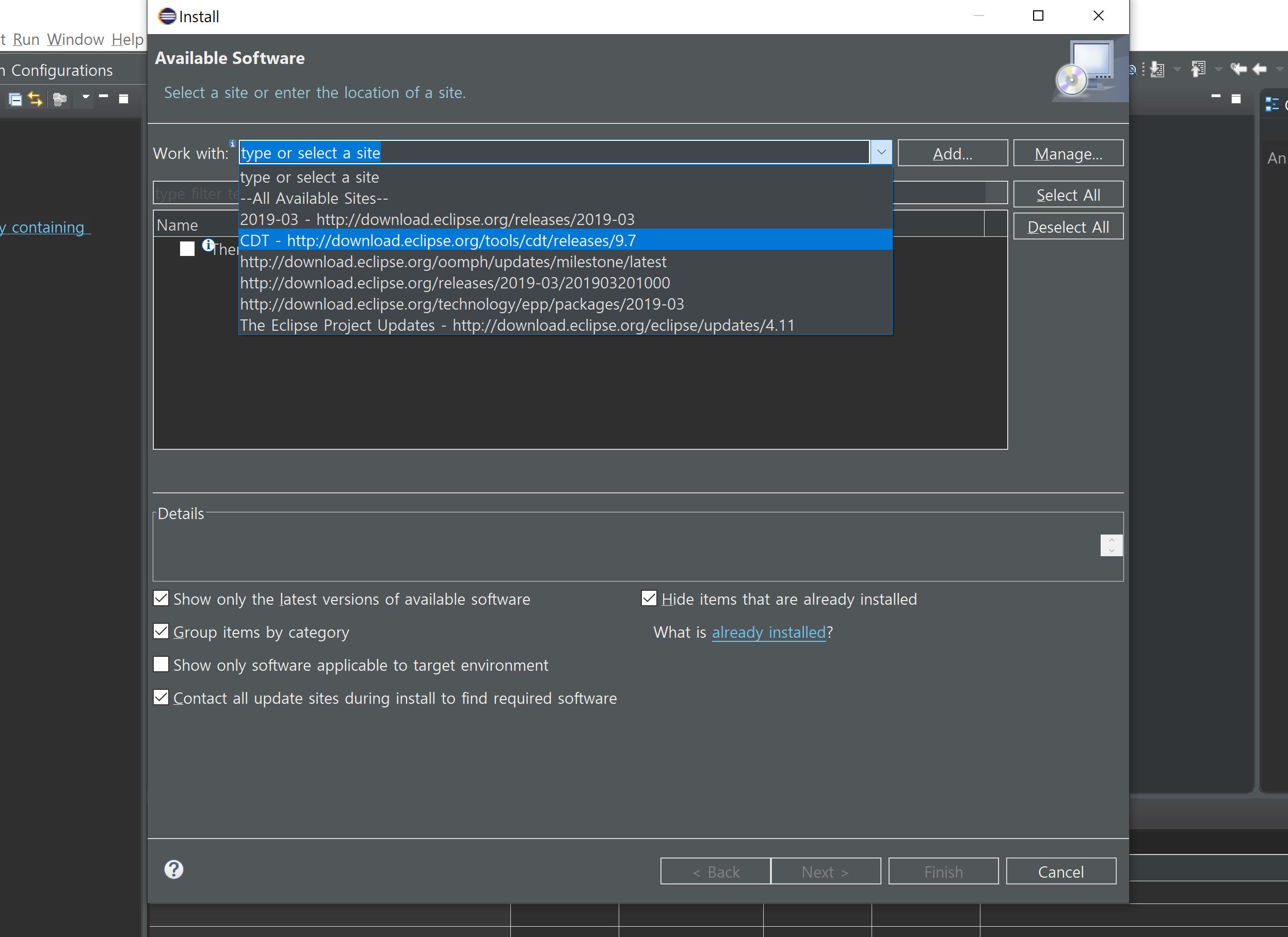 CDT는 이름 그대로 C 개발 도구...인데 어째서 같이 설치할 수 있는 기능이 기본으로 제공되지 않는 지는 아직도 의문입니다.